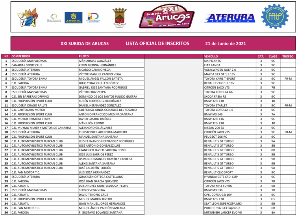 En esta 21ª Edición de la Subida de Arucas también se ha visto que en el 2021 los deportistas tienen ganas de carreras y han respondido a la llamada de la Escudería Aterura, que después de haber tenido que suspender la prueba el año pasado, en esta ocasión afronta la organización de la rampa aruquense con la mayor de las ilusiones, viéndose recompensado ese trabajo con un estupendo plantel de vehículos inscritos, hasta un total de 77.