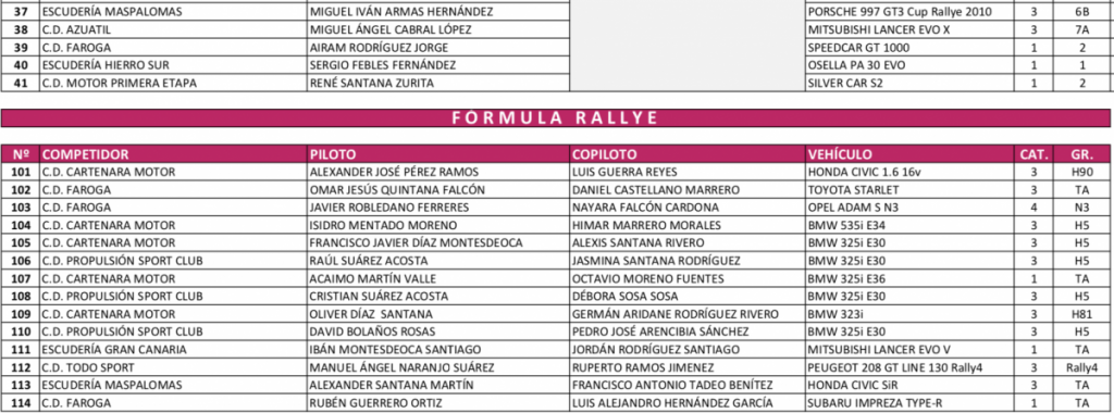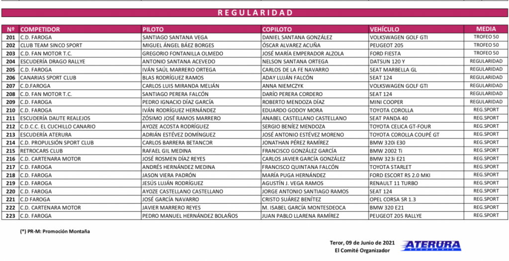 En cuanto a algunos de los participantes que forman parte de la Lista Oficial de Inscritos, destacan entre otros el Peugeot 205 de Miguel A. Báez y Óscar Alvarez que nos visitan desde la isla de Tenerife, el SEAT 124 de Santiago y Darío Perera que disputan la prueba de su municipio o el Ford Escort MKI de Jason Viera y María Puga, todos ellos dentro de la Regularidad Sport.