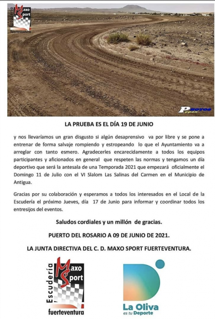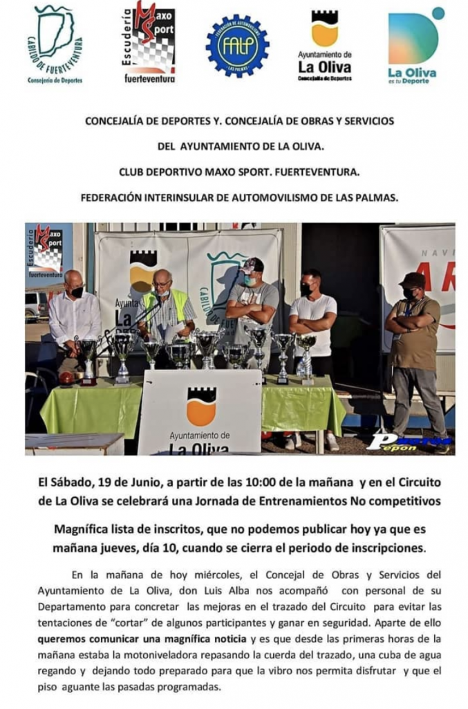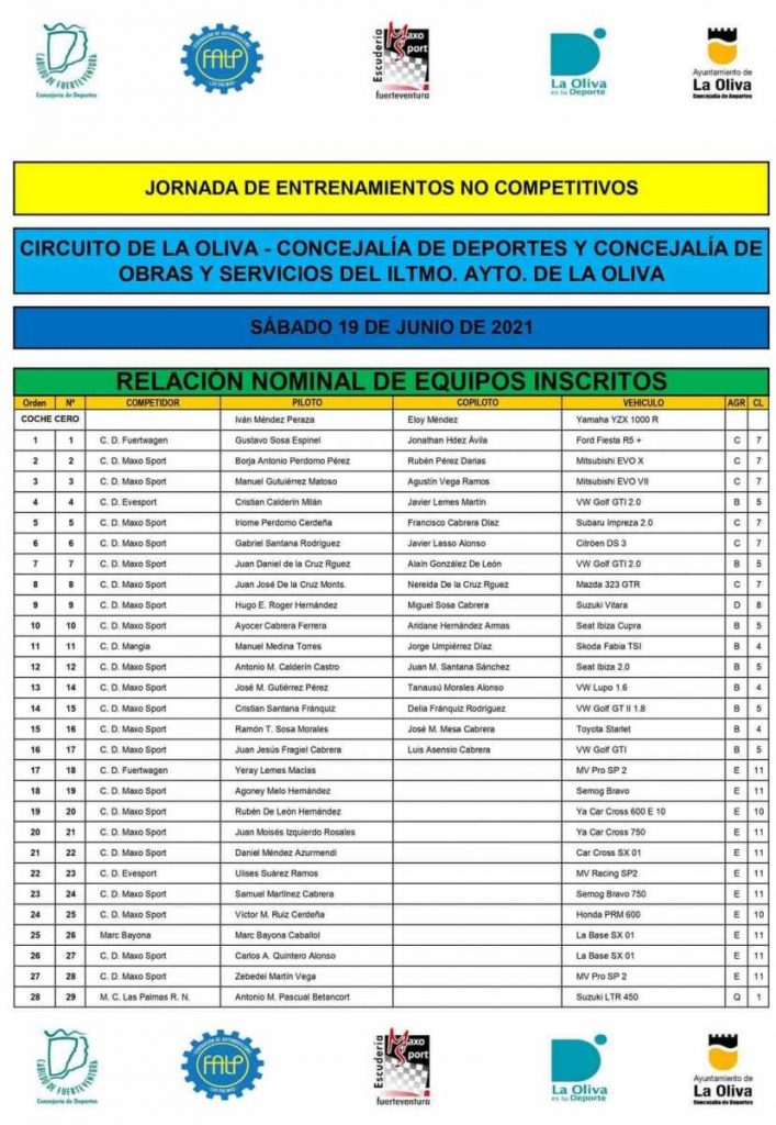 La escudería Maxo Sport ha publicado la lista de inscritos de la jornada de entrenamientos del día 19 en el Circuito de La Oliva (Fuerteventura).