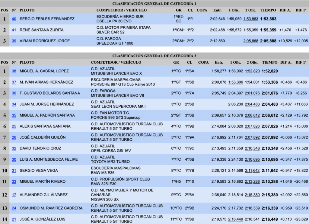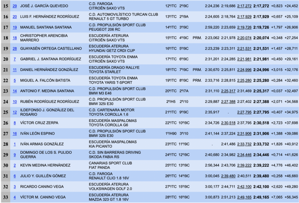 Luis Montesdeoca (Toyota MR2 Turbo) y Sergio Vega (BMW M3 E36), cerrarían las diez primeras plazas siendo noveno y décimo.