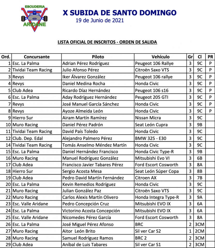 Publicamos la lista oficial de inscritos de la X Subida de Santo Domingo, cita que se disputará este sábado y que es valedera para el Campeonato Insular de La Palma.