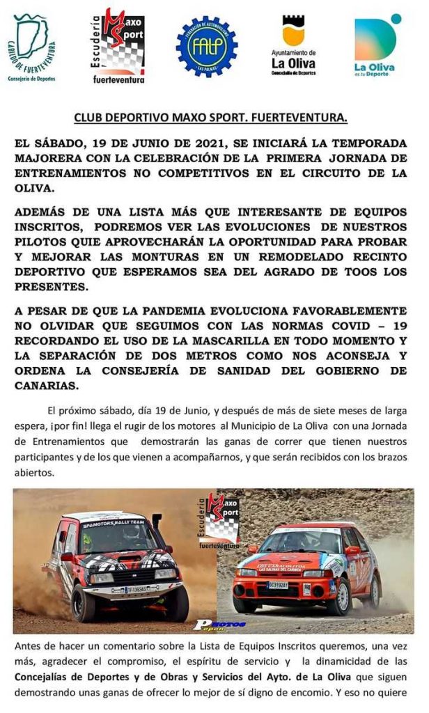 Publicamos la nota informativa relativa a la primera jornada de entrenamientos no competitivos en el Circuito de La Oliva 2021, lo que supone el regreso de la competición a la isla de Fuerteventura