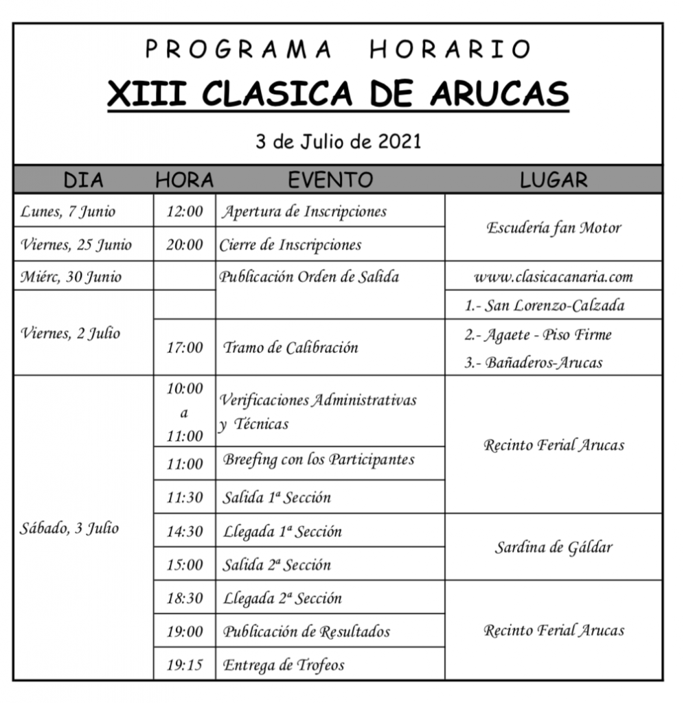 La XIII Clásica de Arucas se disputará el sábado 3 de Julio bajo la organización del Club Fan Motor y la colaboración principal del Ayuntamiento de Arucas. Retorna al calendario tras la suspensión de la edición del 2020 motivado por la pandemia.