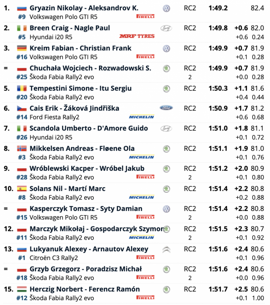Fabian Kreim (Volkswagen Pole Promotion) empató a tiempo con Chuchała, pero se clasificó cuarto, 0.3 segundos más rápido que Simone Tempestini, quinto clasificado. Erik Cais, del Yacco ACCR Team, que es elegible para el ERC-MICHELIN Talent Factory, fue el sexto más rápido en su Ford Fiesta Rally2, seguido por Umberto Scandola, de Hyundai Rally Team Italia, quien se quejó de un problema con la válvula de escape. El piloto de Toksport WRT Škoda Fabia, Andreas Mikkelsen, fue el octavo más rápido, seguido por Kacper Wróblewski y Tomasz Kasperczyk, quienes habían tenido problemas por un problema mecánico.