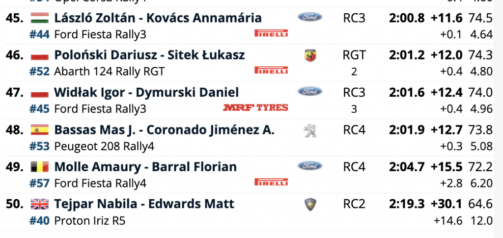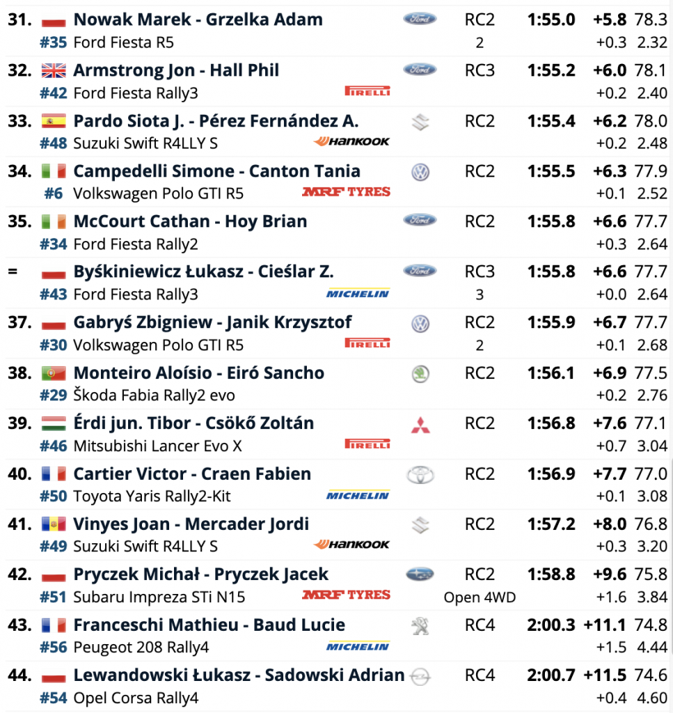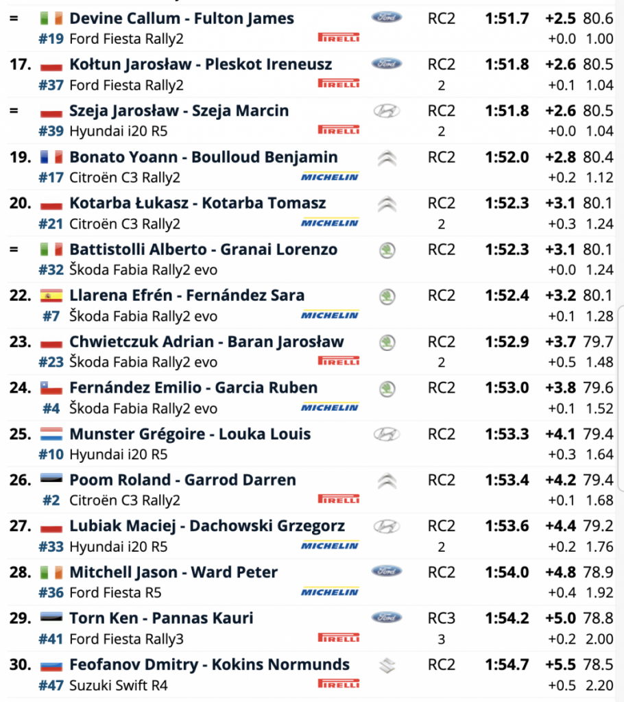 El campeón polaco 2019 del ORLEN Team, Miko Marczyk, fue undécimo y el campeón defensor del ERC, Alexey Lukyanuk, duodécimo en su Citroën C3 Rally2 del Saintéloc Junior Team. Grzegorz Grzyb, Norbert Herczig y Callum Devine completaron el top 15.