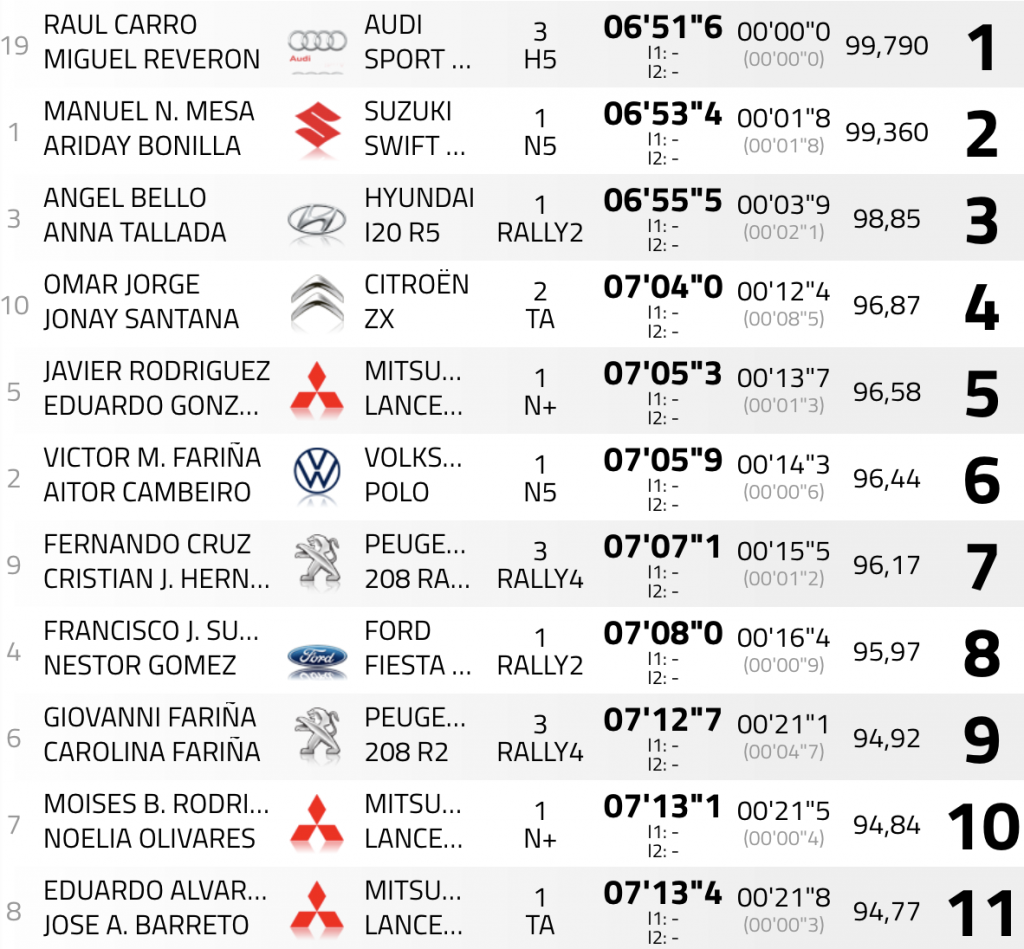 Espectaculares Raúl Carro y Miguel Reverón (Audi Sport Quattro S1 E2), que han marcado el mejor crono de la especial, con 1.8 sobre Mesa y Bonilla, lo que les hace ser terceros y a sólo 2.6 del liderato y 1.6 del segundo lugar.