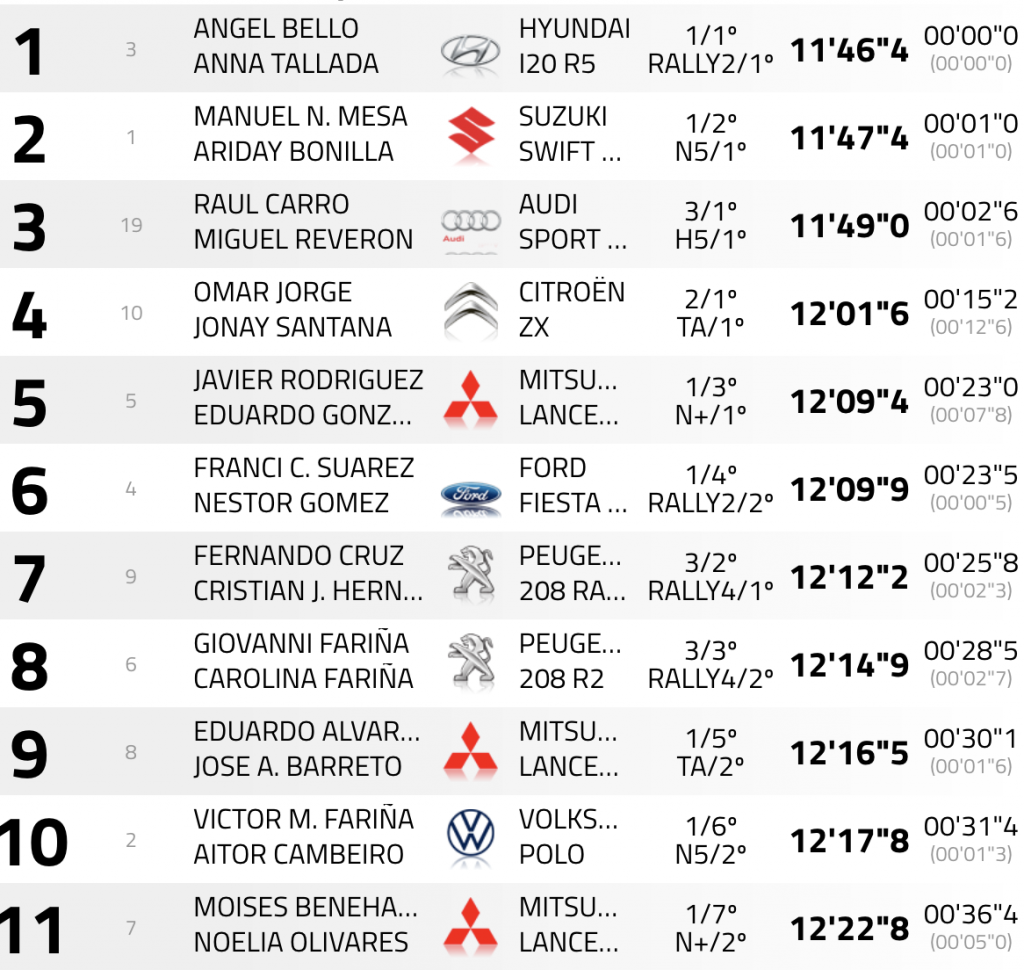 Al sexto lugar descienden Fran Suárez y Néstor Gómez (Ford Fiesta R5 MK2), que han marcado el octavo crono en el tramo. De la novena a la séptima plaza se colocan Fernando Cruz y Cristian Jesús Hernández (Peugeot 208 Rally 4), los séptimos en el tramo.
