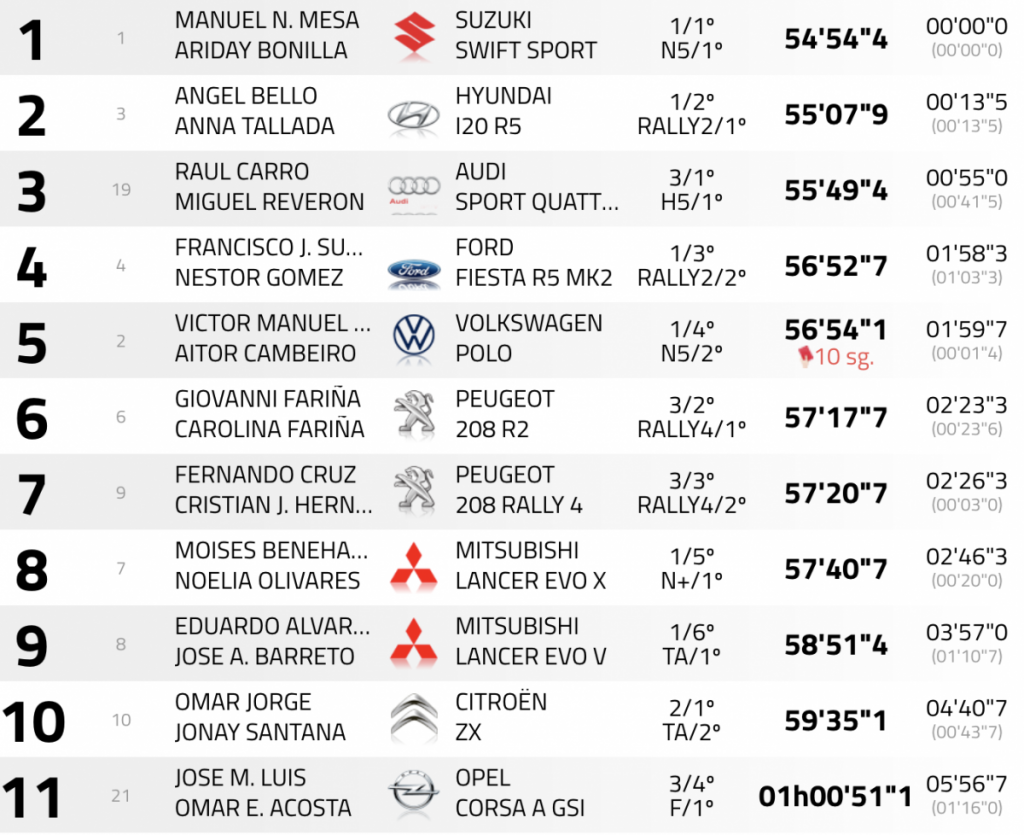 Moisés Rodríguez y Noelia Olivares (Mitsubishi Lancer Evo X) acabaron en octava plaza, a 20 segundos de los anteriores y superando en más de un minuto de Eduardo Álvarez y José A. Barreto (Mitsubishi Lancer Evo V), novenos. Lamentar el abandono de Javier Rodríguez y Eduardo González (Mitsubishi Lancer Evo IX), que tan pronto eran quintos, como bajaban al octavo lugar y luego tenían que abandonar.