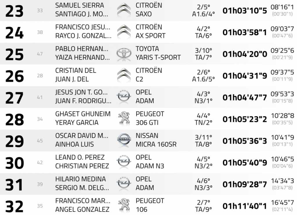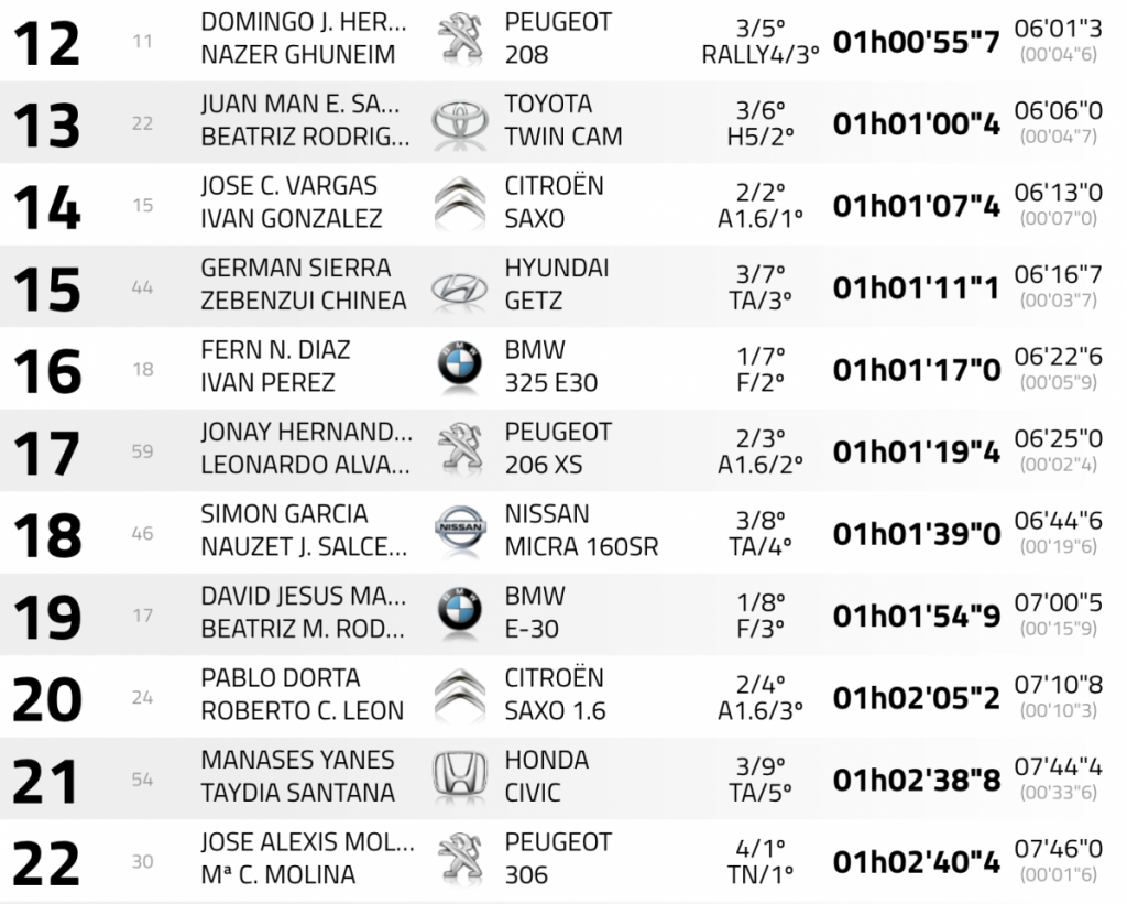Mucho mérito tiene la décima plaza del equipo compuesto por Omar Jorge Navarro y Jonay Santana (Citroën ZX). Empezaron en el cuarto lugar en las dos primeras especiales, pero en la tercera sufrían un percance que les hacía perder más de tres minutos, lo que les relegó al puesto 32 de la general. No decayeron los ánimos y a base de espectaculares tiempos en los tramos de la tarde, con un tercer, cuarto, quinto y sexto mejor tiempo, les logró meter en el top 10. Hicieron posible lo que parecía imposible.