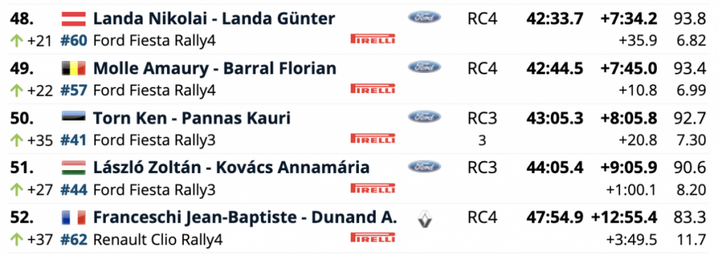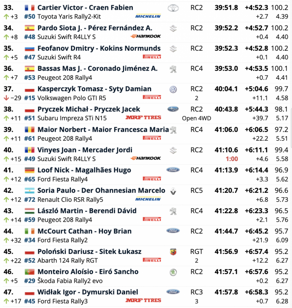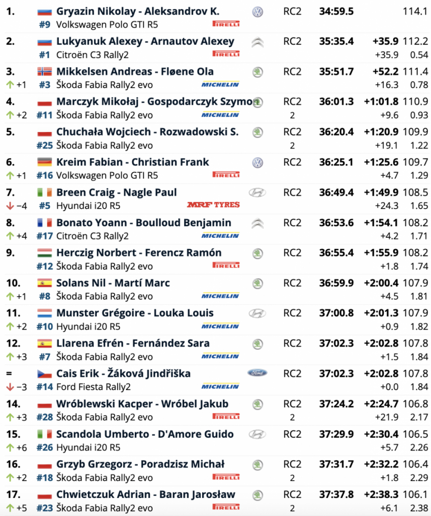 Los húngaros Norbert Herczig y Ramón Ferencz (Škoda Fabia Rally2 evo) son novenos, cerrando las diez primeras plazas los españoles Nil Solans y Marc Martí (Škoda Fabia Rally2 evo).