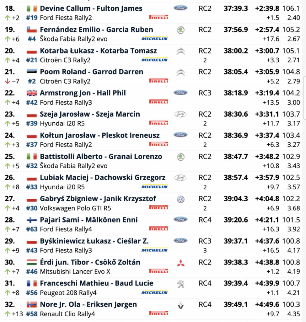 Los también polacos Wojciech Chuchała y S. Rozwadowski (Škoda Fabia Rally2 evo) son quintos, a 191 de sus compatriotas y seguidos de los alemanes Fabian Kreim y Frank Christian (Volkswagen Polo GTI R5).