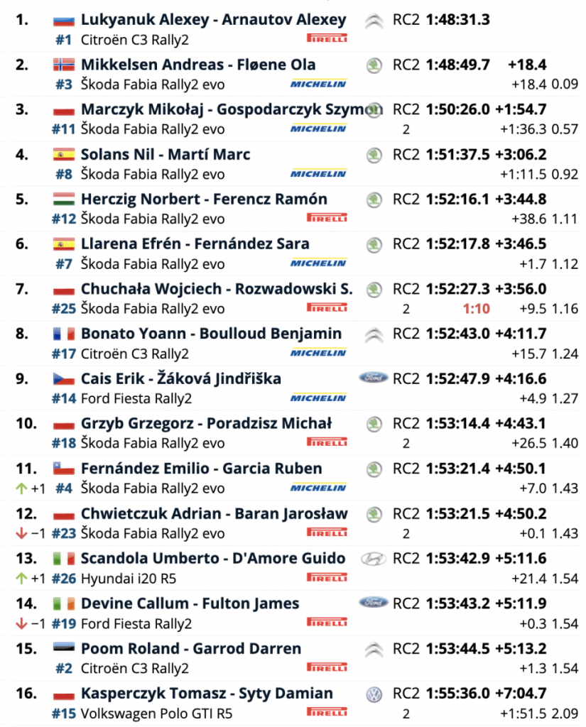 Los galos Yoann Bonato y Benjamin Boulloud (Citroën C3 Rally2) eran octavos, seguidos de los checos Erik Cais y Jindřiška Žáková (Ford Fiesta Rally2), cerrando el top 10 los también polacos Grzegorz Grzyb y Michał Poradzisz (Škoda Fabia Rally2 evo).