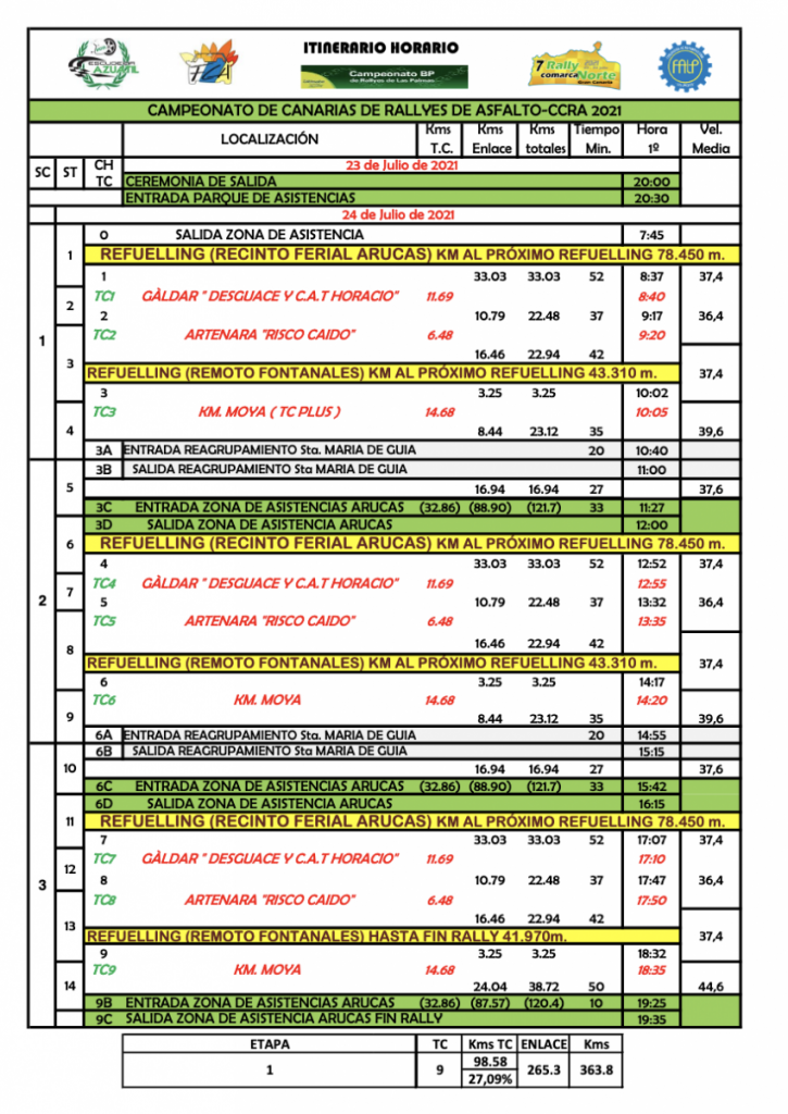 Quedan definidas los parques de asistencias, que repiten el escenario de la ciudad de Arucas (recinto ferial y aparcamientos polideportivo municipal), por donde pasará la caravana del rallye en cuatro ocasiones. Las verificaciones técnicas siguen en Guía y se repite en el magnífico edificio del Mercado Agrícola, junto a la autovía GC-2. Posteriormente regresa la ceremonia de salida a partir de las 20 horas del viernes, que tendrá de escenario la Avenida Mancomunidad del Norte, igualmente en el casco de Guía muy cerca del punto de verificaciones.