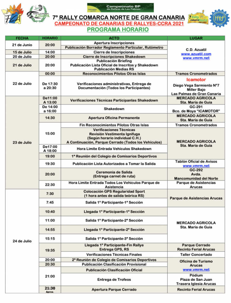 Un 7º Rallye Comarca Norte de Gran Canaria, bajo la organización del CD. Azuatil, que este mismo lunes abre su periodo de inscripciones. Recordamos que en 2021 se regresará al Campeonato de Canarias de Rallys de Asfalto, además de ser puntuable para el Campeonato BP de Las Palmas 2021 y los Campeonatos de Regularidad Sport (RS).