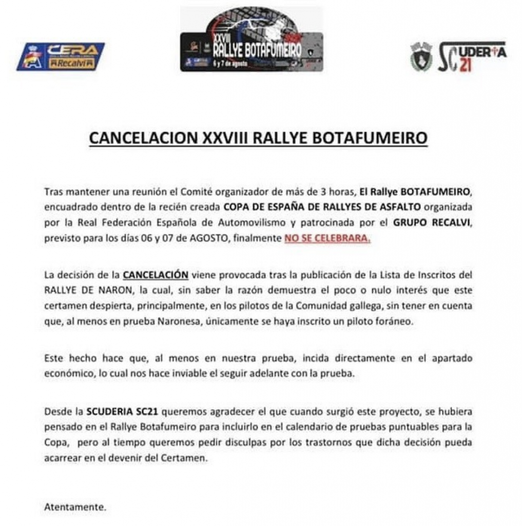Problemas económicos propician que los organizadores del Rallye Botafumeiro hayan decidido suspender la prueba de la Copa de España de Rallyes de Asfalto.