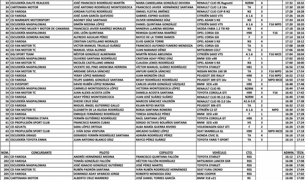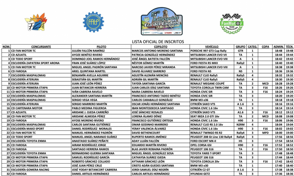 Lista de inscritos del 5º Rallysprint Era del Cardón-Villa de Agüimes, que cuenta con 70 equipos equipos