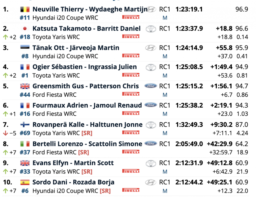 La sorpresa agradable la están dando Katsuta y Barritt, que en la especial final, Oserian (18.87 km), marcaban el mejor crono junto a los galos Sébastien Ogier y Julien Ingrassia (Toyota Yaris WRC), lo que le posibilitó recortarle 39.8 a los líderes y situarse a 18.8.
