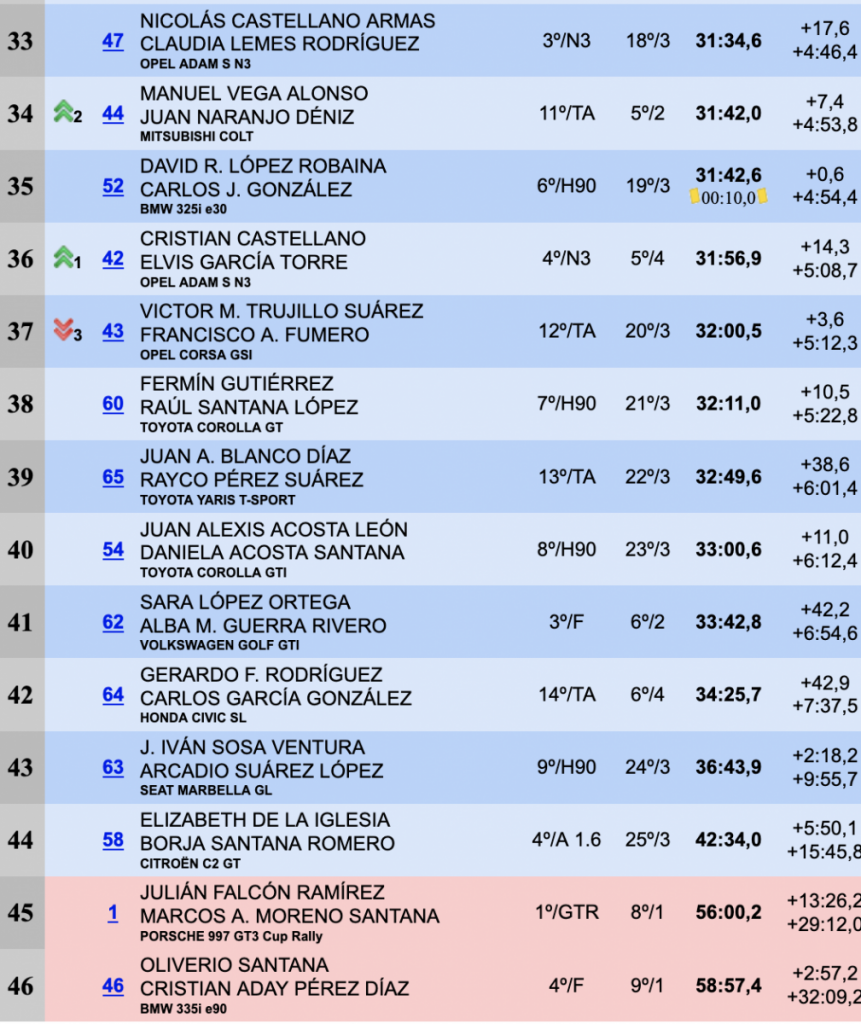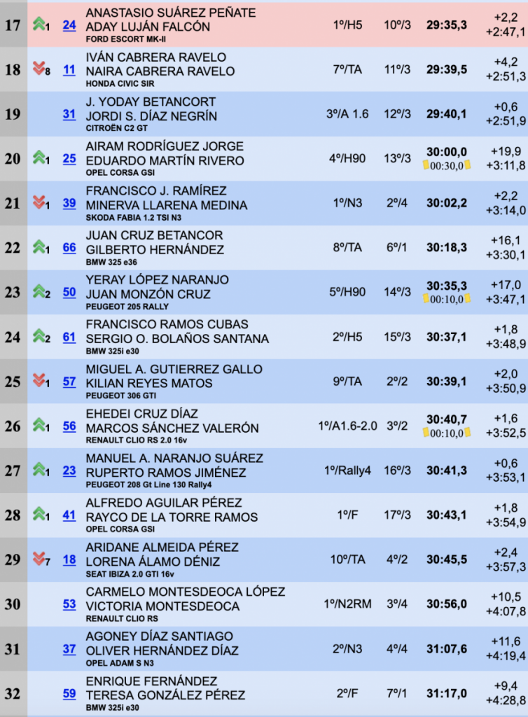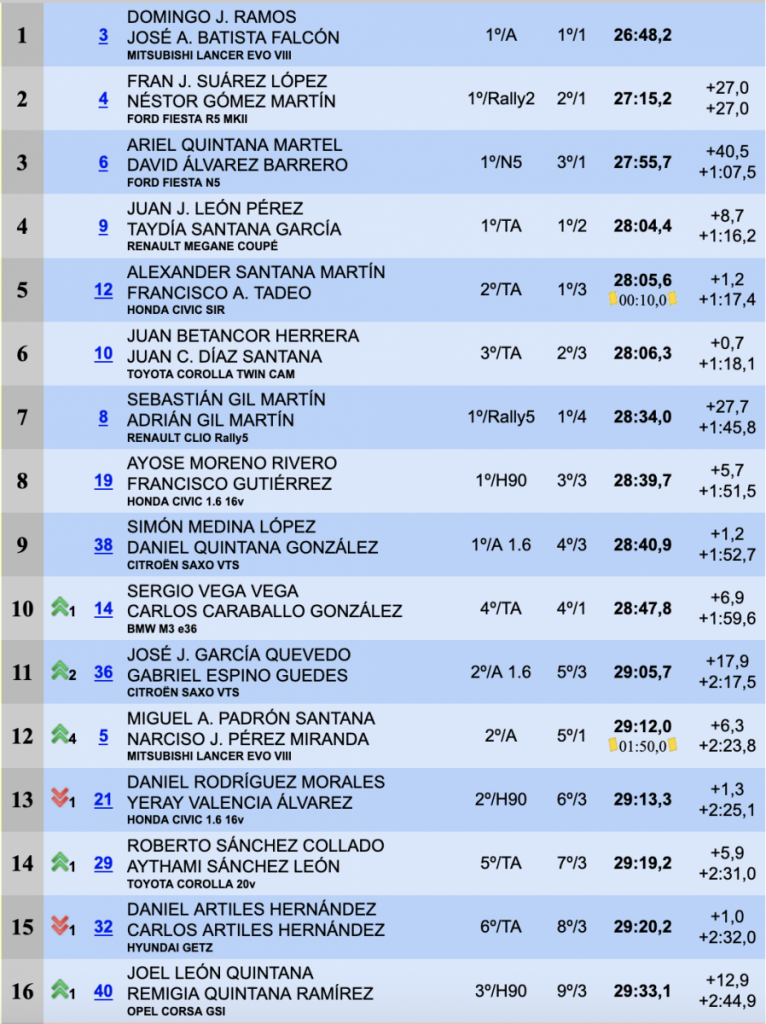 Ya en la séptima posición finalizó con la suma de los tiempos de los seis tramos, el equipo de Sebastián y Adrián Gil, que salieron intactos de su segunda prueba con el Renault Clio Rally5. A continuación lo hicieron Ayoze Moreno-Francisco Gutiérrez, octavos con otro Honda Civic y primeros del grupo H90, con los jóvenes Simón Medina-Daniel Quintana a sólo 1,2 segundos en la novena plaza con un Citroen Saxo, que de paso se llevaron el Trofeo al Mejor Piloto Debutante. En el apartado de copilotos, sería Taydía Santana la vencedora.