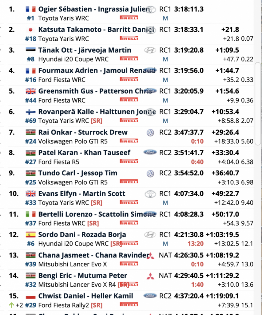 Katsuta y Barritt se aprovecharon de la situación y se ponían, por primera vez en su carrera, líderes de una cita del Campeonato del Mundo de Rallys, pero con los galos Sébastien Ogier y Julien Ingrassia (Toyota Yaris WRC) en segunda posición a sólo 0.8, renta que recortaría en la siguiente prueba, quedando ambos empatados a falta de dos tramos, pero los campeones del mundo pusieron toda la carne en el asador para terminar superándoles en 21.8 a unos más que prometedores Takamoto y Daniel, que llevan tiempo asomando y demostrando que quieren establecerse en el nivel superior.