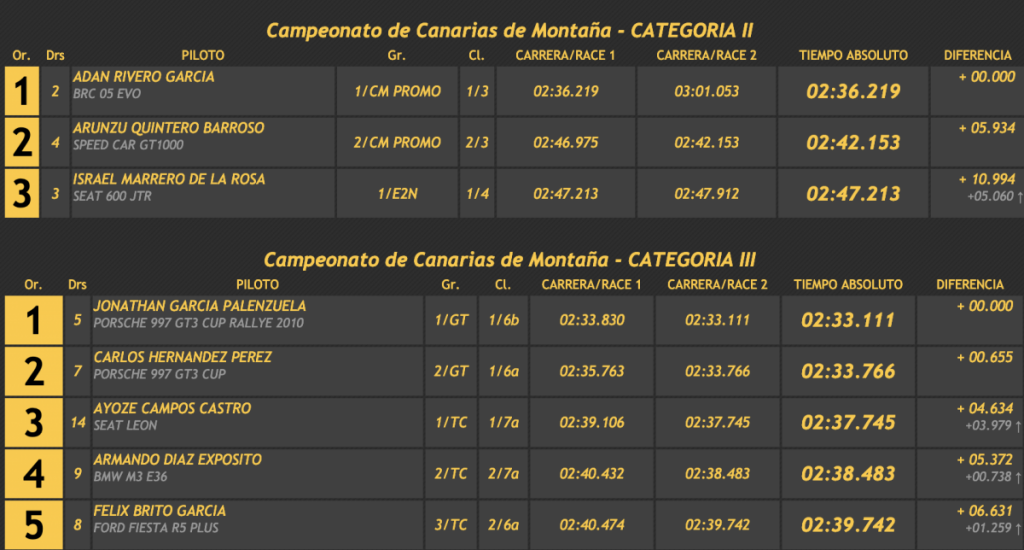 De esta manera Adan Rivero (BRC 05 Evo) fue el más rápido, seguido de Arunzú Quintero (Speed Car GT1000) y Israel Marrero (Seat 600 JTR).
