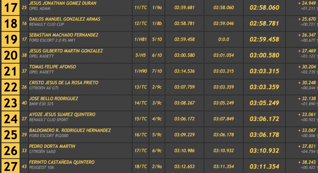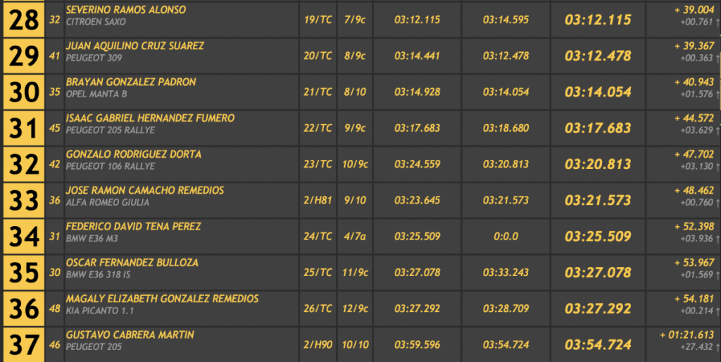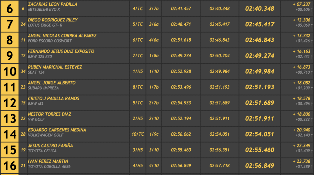 Meritorio tercer lugar para Ayoze Campos (Seat León MKI), que empezó y acabó en ese puesto, lo mismo que ocurrió con los siguientes pilotos en la general, que mejoraron su primer registro, pero no les valió para subir un puesto en la general, casos de Armando Díaz (BMW M3 E36), cuarto, Félix Brito (Ford Fiesta R5 Plus), quinto, Zacarías León (Mitsubishi Lancer Evo X), sexto.