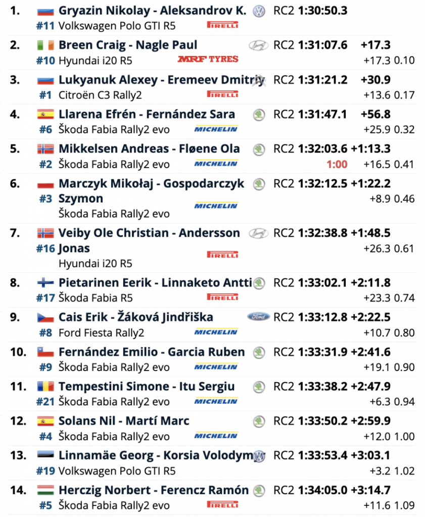 Los del Polo terminaron 17.3 segundos por delante de los irlandeses Craig Breen y Paul Nagle (Hyundai i20 R5), que se adjudicaron el primer podio del equipo MRF Tires en el ERC con el segundo lugar, mientras que los rusos Alexey Lukyanuk y Dmitriy Eremeev (Citroën C3 Rally2), finalizaron terceros, ampliando su ventaja al frente del ERC.