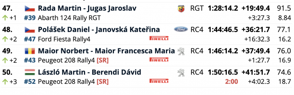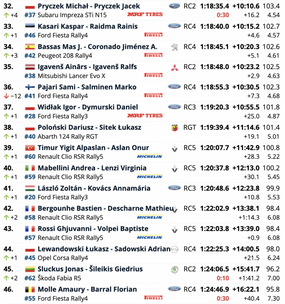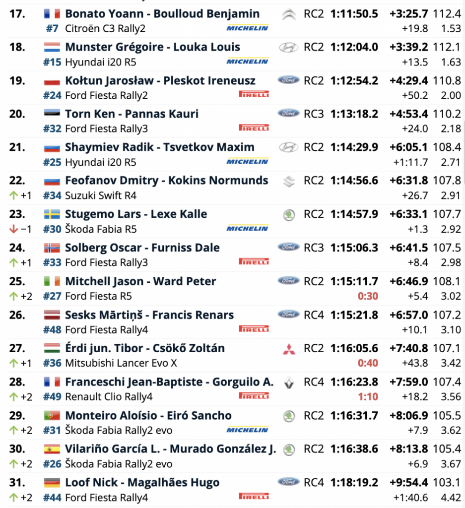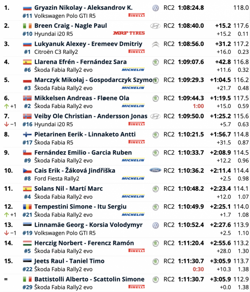 Los españoles Efrén Llarena y Sara Fernández (Škoda Fabia Rally2 Evo) eran segundos en los tramos de la mañana del viernes, bajaban al tercer puesto por la tarde, y en la mañana de hoy han perdido el último escalón del podio ante el empuje de los rusos Alexey Lukyanuk y Dmitriy Eremeev (Citroën C3 Rally2), que han ido remontando puestos desde la quinta plaza a la tercera actual.