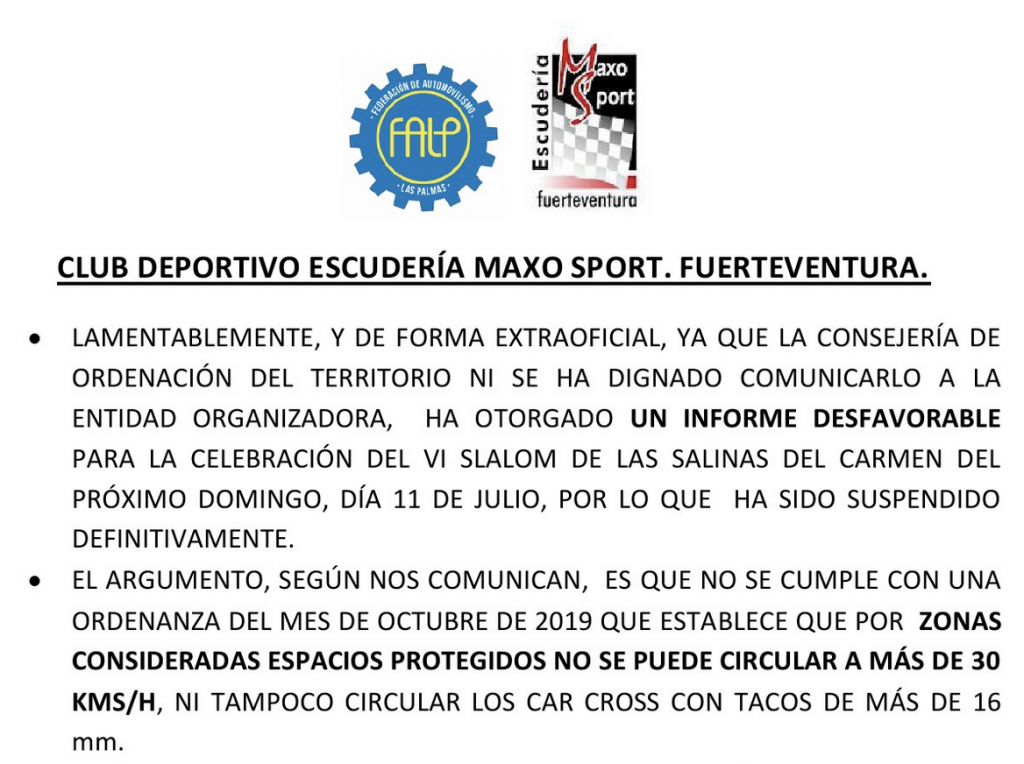 El V Slalom Salinas del Carmen, a celebrarse el 11 de Julio, ha sido suspendido por parte de su organizador, la Escudería Maxo Sport.