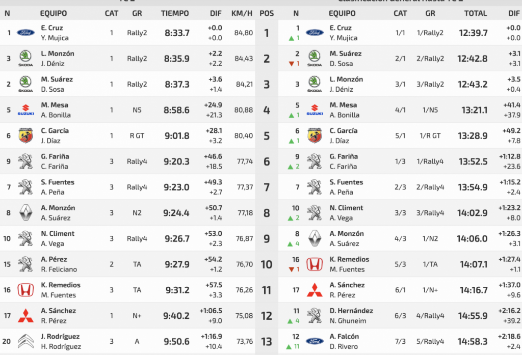 Después de que en la primera especial los que mandaran fueran Miguel Ángel Suárez-Daniel Sosa (Skoda Fabia Rally2 Evo), en el segundo tramo perdían 3.6 y el liderato, que pasaba a manos de Cruz y Mujica con una renta de 3.1.