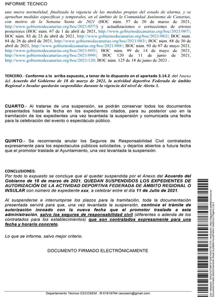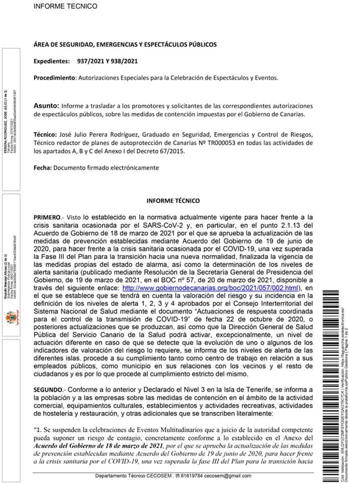 El cambio se debe a las restricciones recogidas en el nivel 3 de alerta por coronavirus, y que afectan en estos momentos a la isla de Tenerife, debido principalmente al crecimiento descontrolado del número de casos activos de la Covid19. El informe técnico de seguridad, firmado por la empresa CECOSEM (se adjunta), resuelve negativamente la puesta en marcha del proyecto, decisión que comparte en idéntica dirección la Policía Local de La Guancha, por lo que se ha optado finalmente por el aplazamiento.