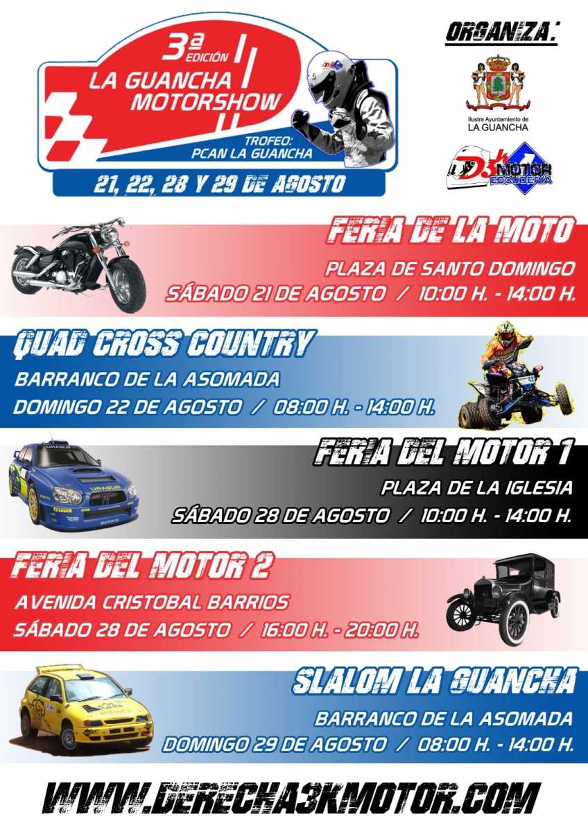 La edil de Deportes, Verónica Domínguez, y el presidente de la escudería organizadora, Juanma González, han reservado en el calendario los dos últimos fines de semana del próximo mes de agosto para desarrollar las pruebas y exposiciones incluidas en el proyecto automovilístico del municipio, en el que también se recoge la disputa del trofeo PCAN La Guancha. Concretamente, durante la mañana del sábado 21 de agosto está previsto que se lleve a cabo la I Feria de la Moto en el barrio de Santo Domingo. Al día siguiente, el barranco de La Asomada servirá de escenario para disputar el Cross Quads Country, unas de las grandes citas del programa. Las ferias del motor en la plaza de la Iglesia y la avenida Cristóbal Barrios se desarrollarán el sábado 28 de agosto mientras que el Slalom La Guancha tendrá lugar el domingo 29, en el trazado de tierra del barranco de La Asomada.
