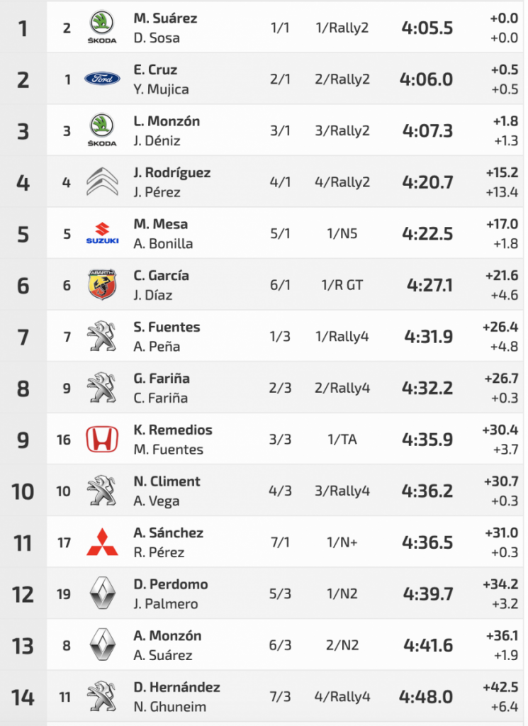 Cuartos son los palmeros Jorge Rodríguez-Javier Pérez (Citroën DS3 R5), que se han quedado a 15.2 de la cabeza, a 13.4 del tercero y superando en 1.8 a Manuel Mesa-Ariday Bonilla (Suzuki Swift R+ N5), quintos. El sexto lugar es para Carlos David García-Jordi Díaz (Abarth 124 Rally), que están a 4.6 de los del Suzuki.