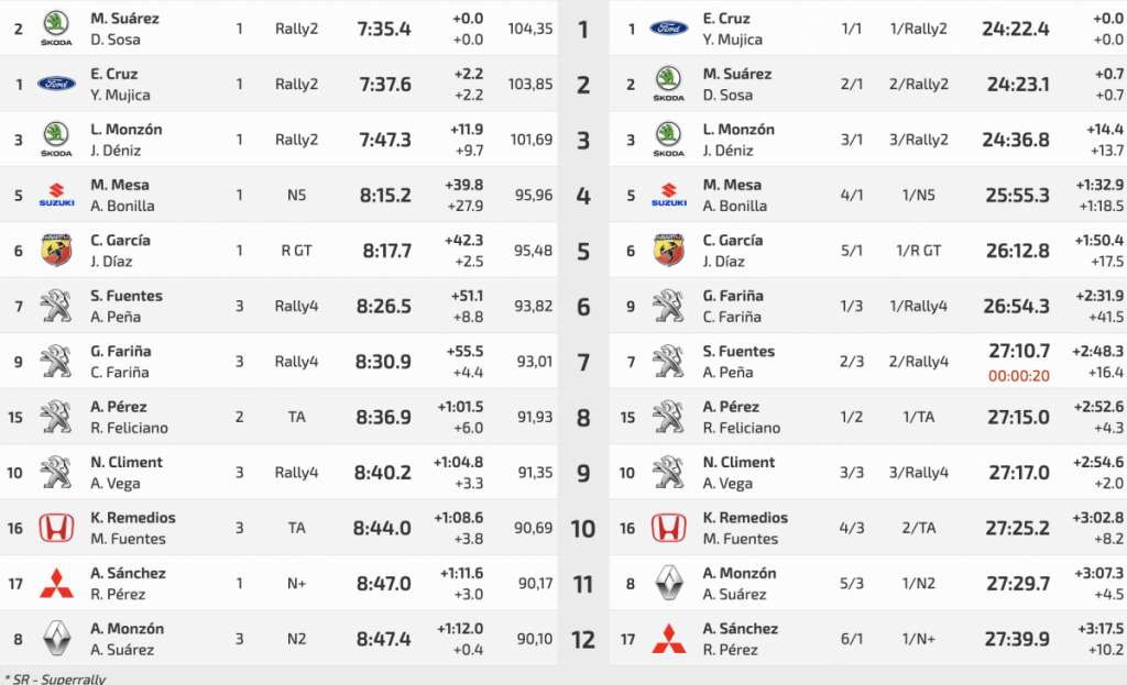 Las siguientes posiciones empiezan a tener una diferencia considerable entre unos y otros, con Manuel Mesa-Ariday Bonilla (Suzuki Swift R+ N5) cuartos a 17.4 de Carlos David García-Jordi Díaz (Abarth 124 Rally), quintos, mientras que los líderes de los rally4, Giovanni Fariña-Carolina Fariña (Peugeot 208 R2), son sextos, a 16.4 de Sergio Fuentes-Alain Peña (Peugeot 208 Rally4), que a pesar de una penalización de 20 segundos han podido remontar puestos.