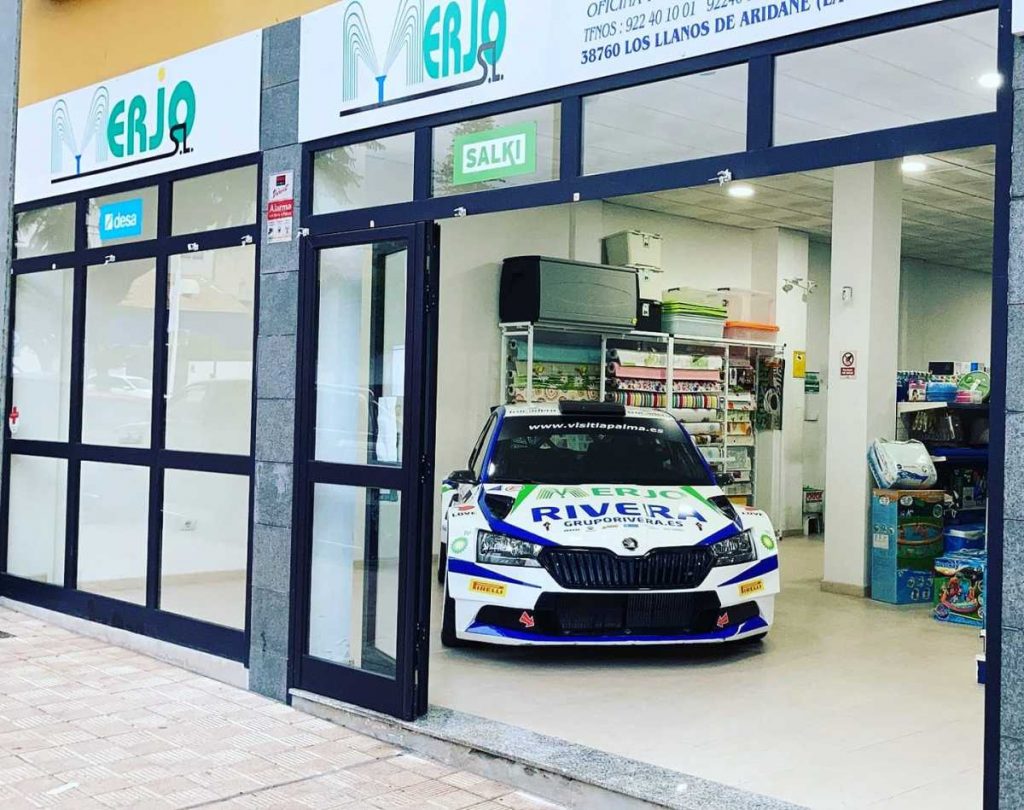 El Skoda Fabia Rally2 con el que Miguel Ángel Suárez y Daniel Sosa lograron la victoria en el Rally Senderos de La Palma estará expuesto durante toda esta semana en la Ferreteria Merjo, patrocinador del equipo.