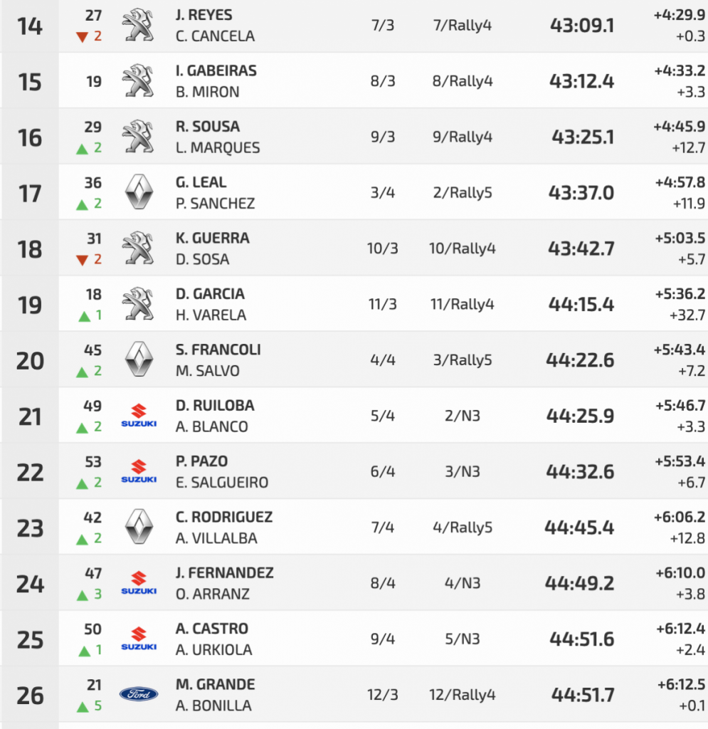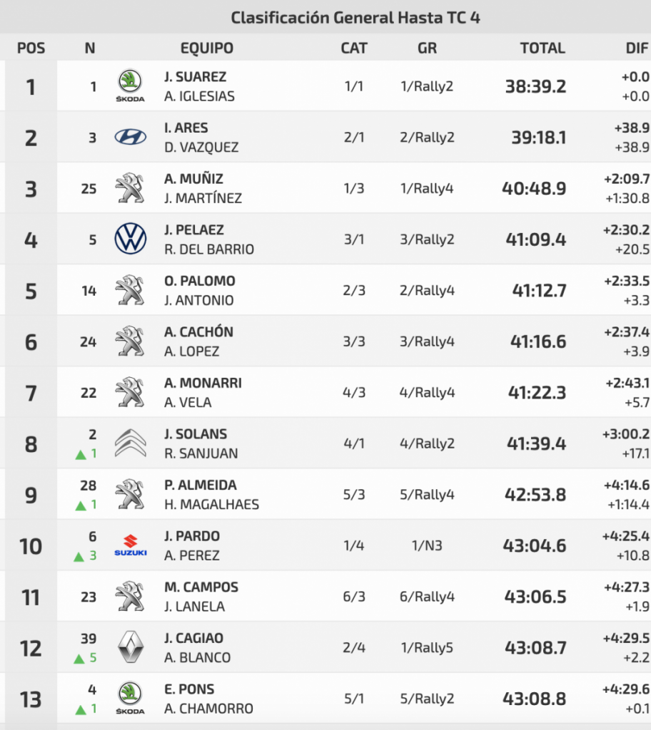 Los asturianos no han tenido rivales y han logrado el triunfo en todas las especiales celebradas. Los únicos que les estaban aguantando, pero ya a más de 10 segundos tras la segunda especial, eran los catalanes Jan Solans y Rodrigo Sanjuan, pero un pinchazo en el tercer tramo en su Citroën C3 R5 les alejó de la cabeza y perder toda opción al triunfo al finalizar el día a más de tres minutos de los líderes.