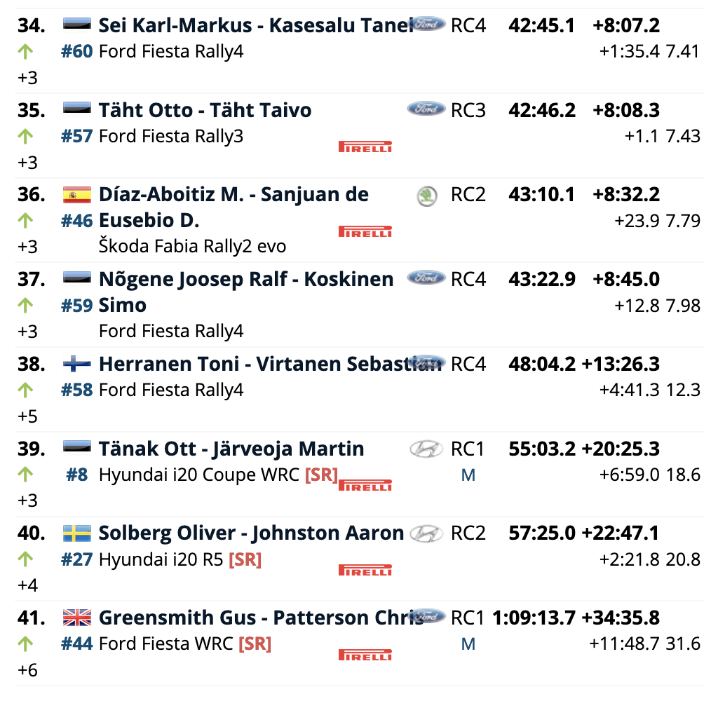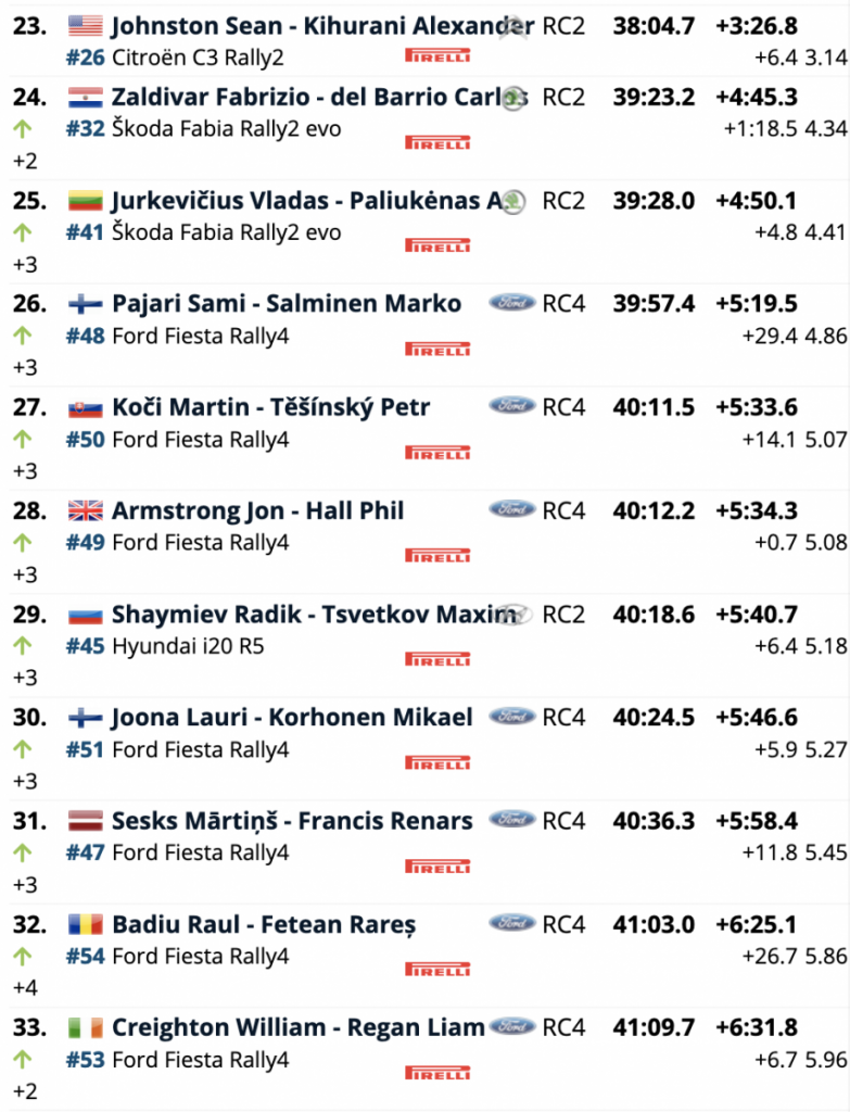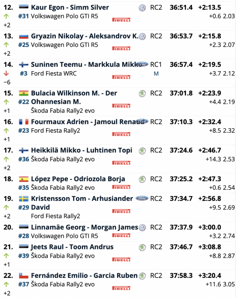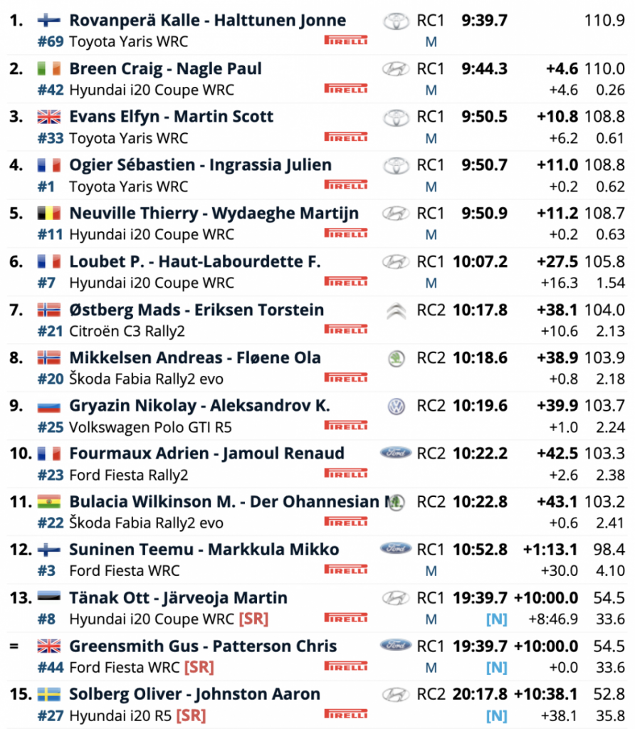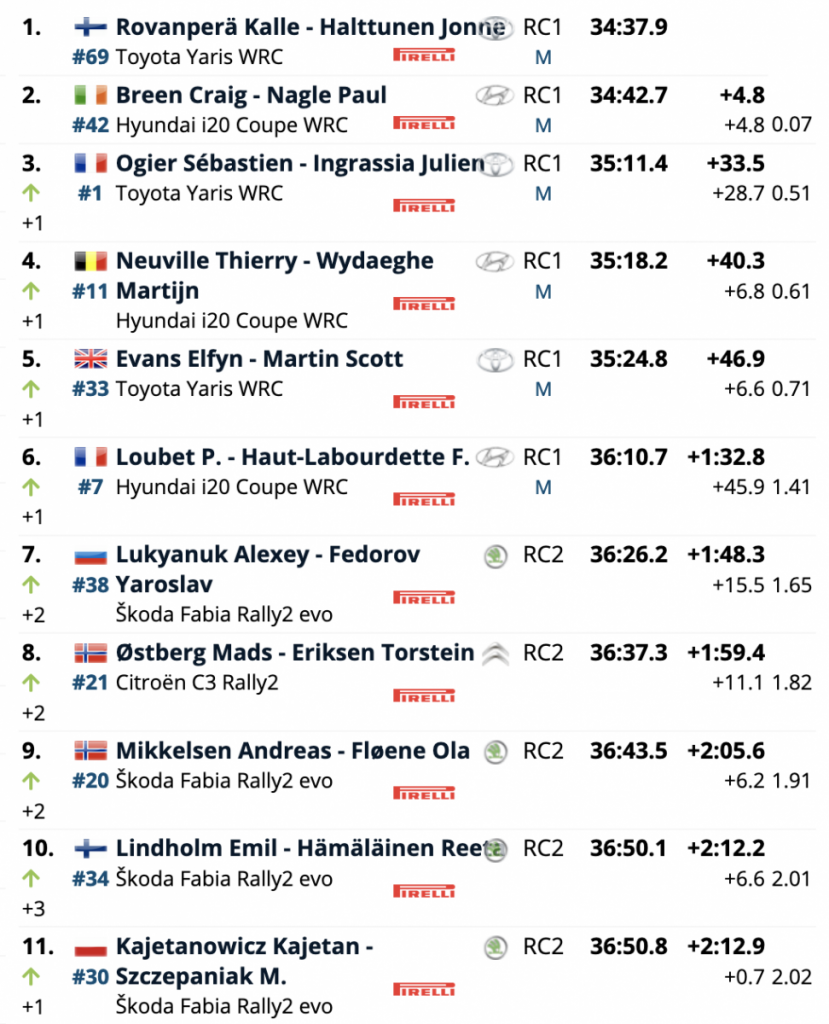 Terceros son los galos Sébastien Ogier y Julien Ingrassia (Toyota Yaris WRC), que están a 33.5 de la cabeza, a 28.7 del segundo lugar y superando en 6.8 a los belgas Thierry Neuville y Martijn Wydaeghe (Hyundai i20 Coupe WRC), cuartos.