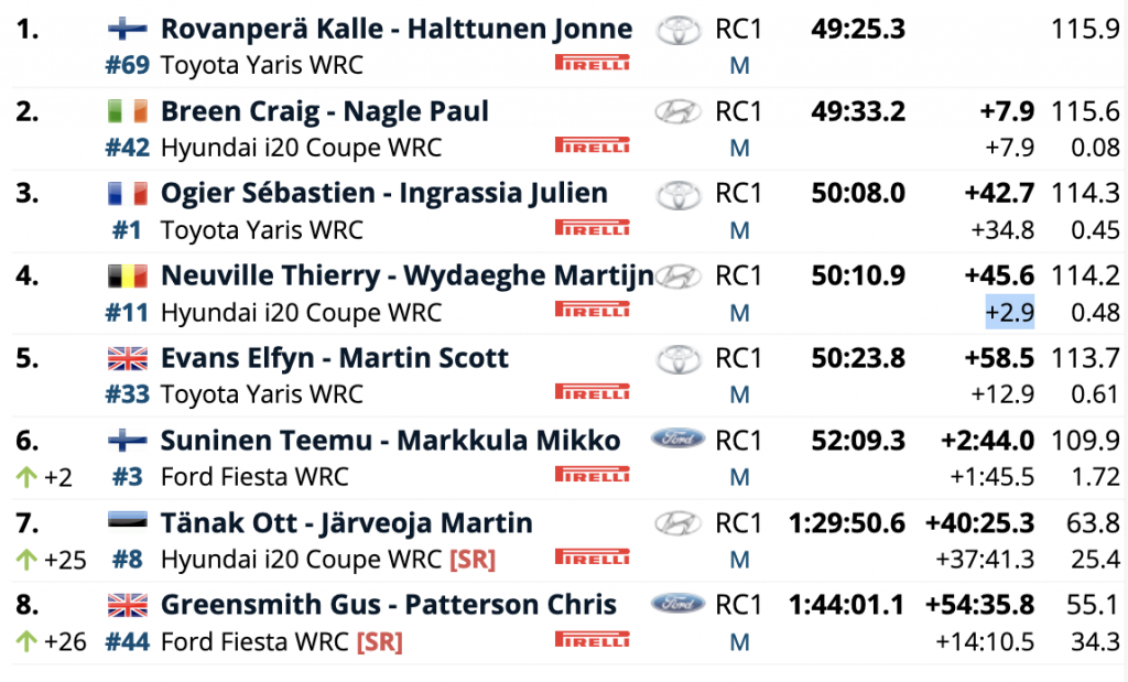 Más alejados de los anteriores están los galos Sébastien Ogier y Julien Ingrassia (Toyota Yaris WRC), terceros, que están a 42.7 del liderato y 34.8 del segundo lugar, superando en 2.9 a los belgas Thierry Neuville y Martijn Wydaeghe (Hyundai i20 Coupe WRC), cuartos.