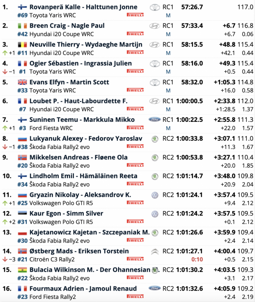 Jornada fructífera para los fineses Kalle Rovanperä y Jonne Halttunen (Toyota Yaris WRC), que merced a la victoria en cinco de las ocho especiales terminan como líderes de la cita del Campeonato del Mundo de Rallys.