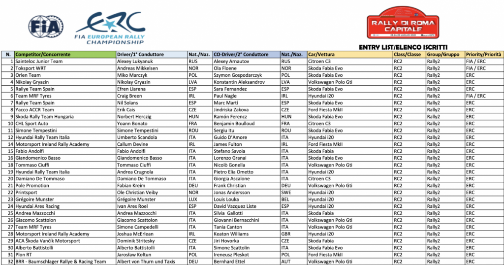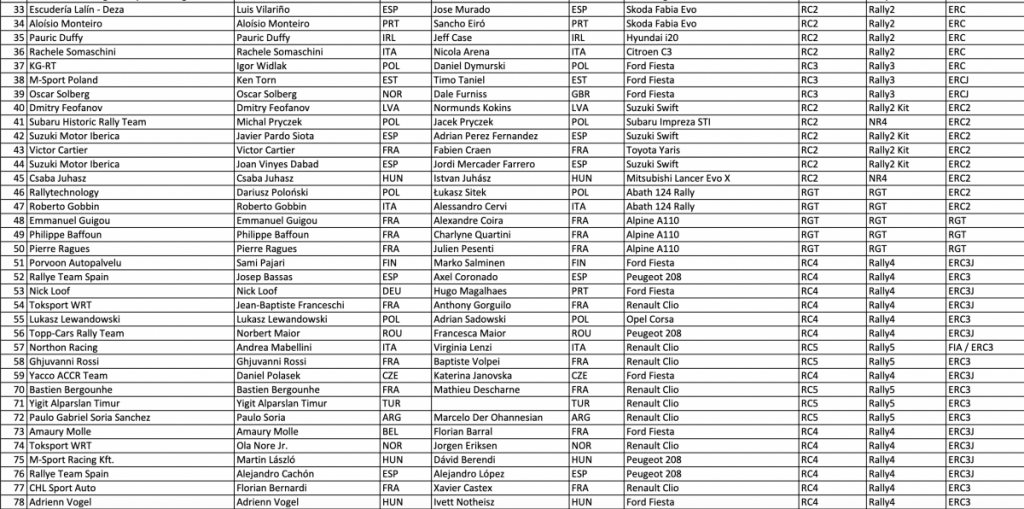 De las tripulaciones registradas en el ERC, 34 estarán con unidades Rally2, mientras que los campeonatos ERC Junior y ERC3 Junior han atraído un total de 12 inscripciones.