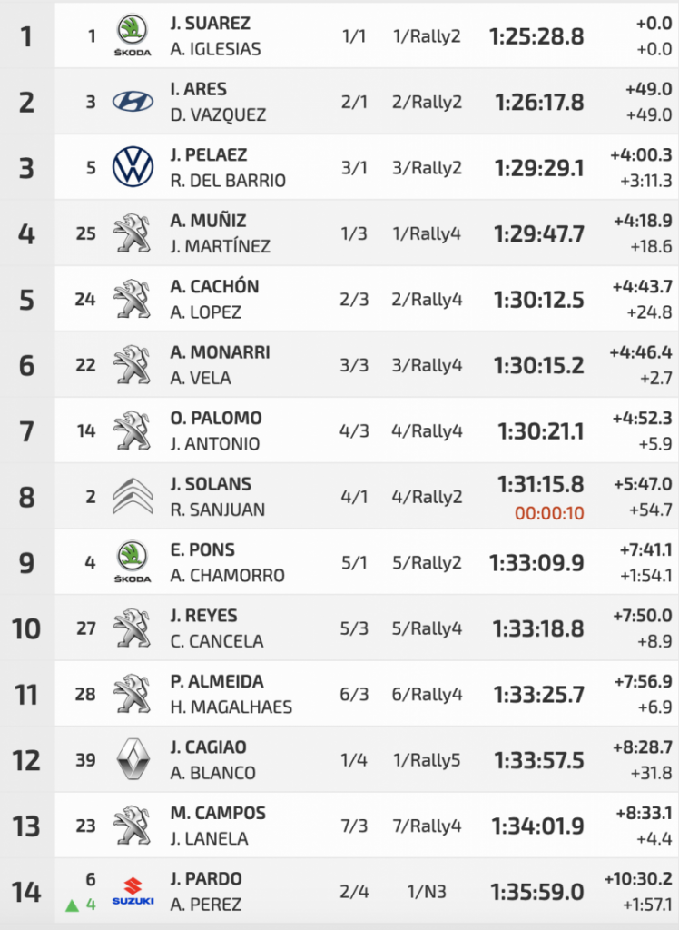 Terceros acabaron José Luis Peláez y Rodolfo del Barrio (Volkswagen Polo GTI R5), logrando arrebatarles el último escalón del podio a unos más que sorprendentes Álvaro Muñiz y Javier Martínez (Peugeot 208 Rally 4), ganadores de la Peugeot Rally Cup Ibérica, que eran terceros al final del primer día.