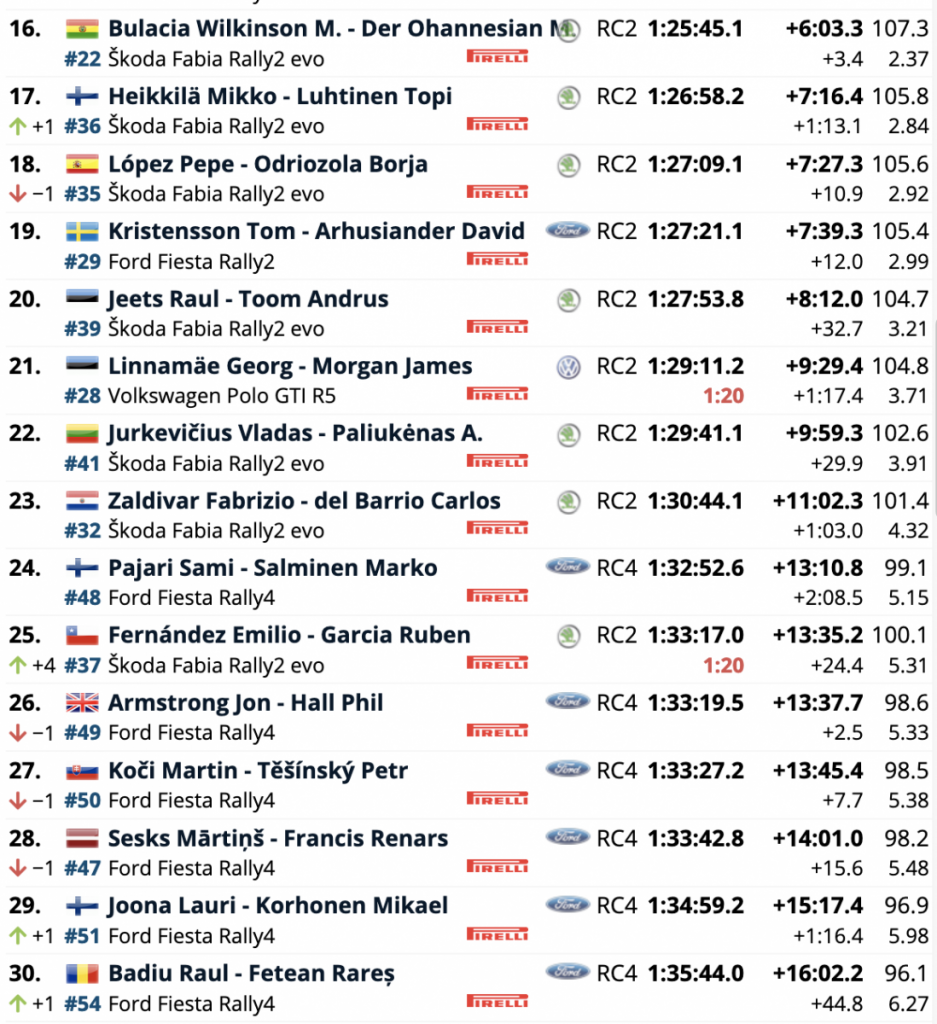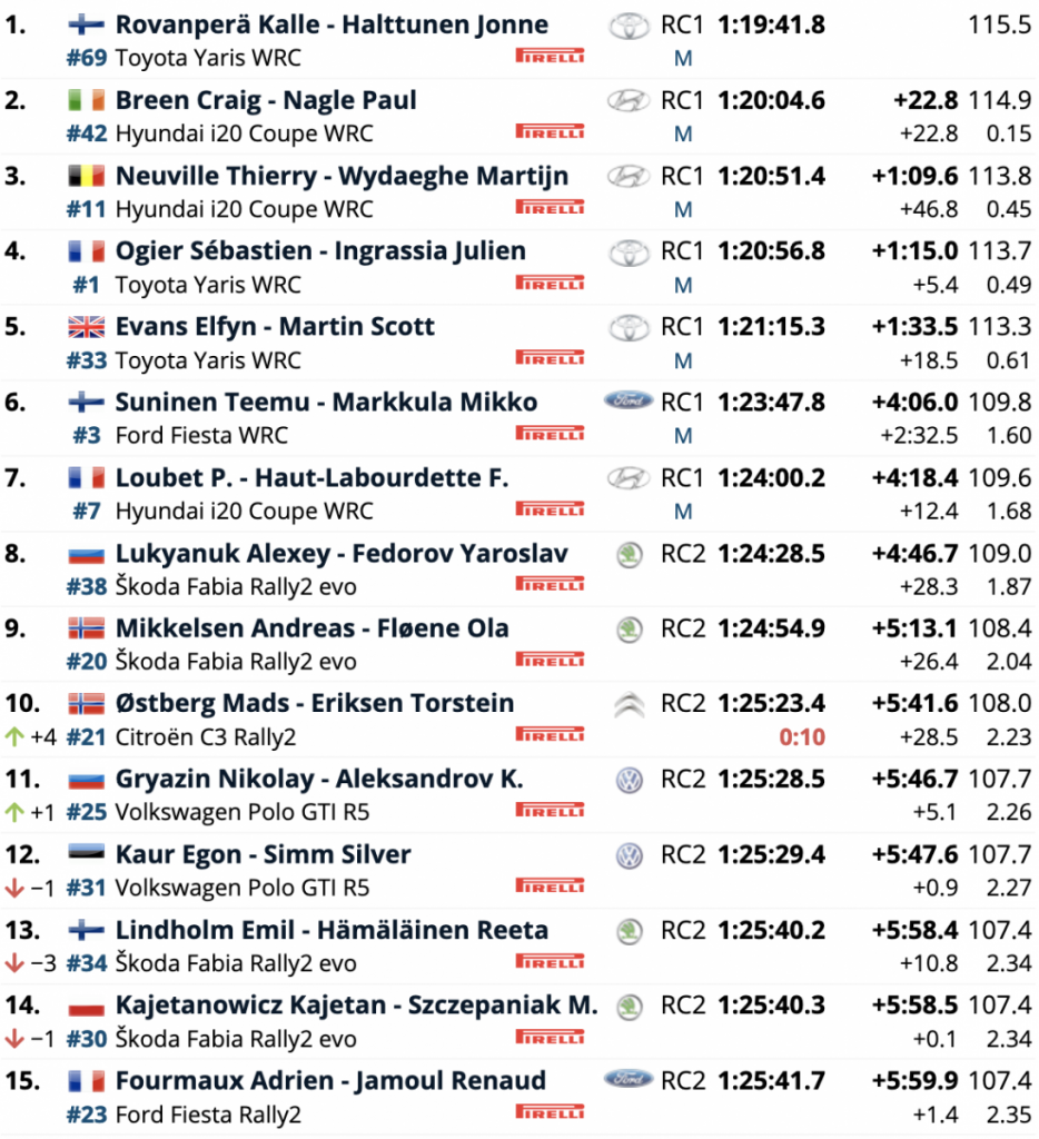 Terceros continúan los belgas Thierry Neuville y Martijn Wydaeghe (Hyundai i20 Coupé WRC), con un estrecho margen sobre los galos Sébastien Ogier y Julien Ingrassia (Toyota Yaris WRC) de sólo 5.4.