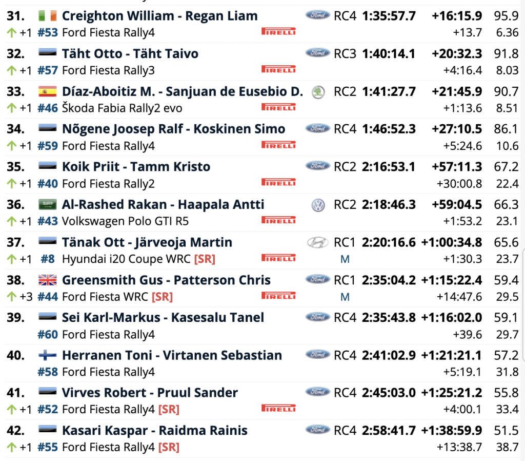 Los estonios Ott Tänak y Martin Järveoja (Hyundai i20 Coupé WRC), que tras el doble pinchazo que les obligó a tomar el camino del abandono, se han reenganchado, siendo los más rápidos en tres tramos y segundos en uno.