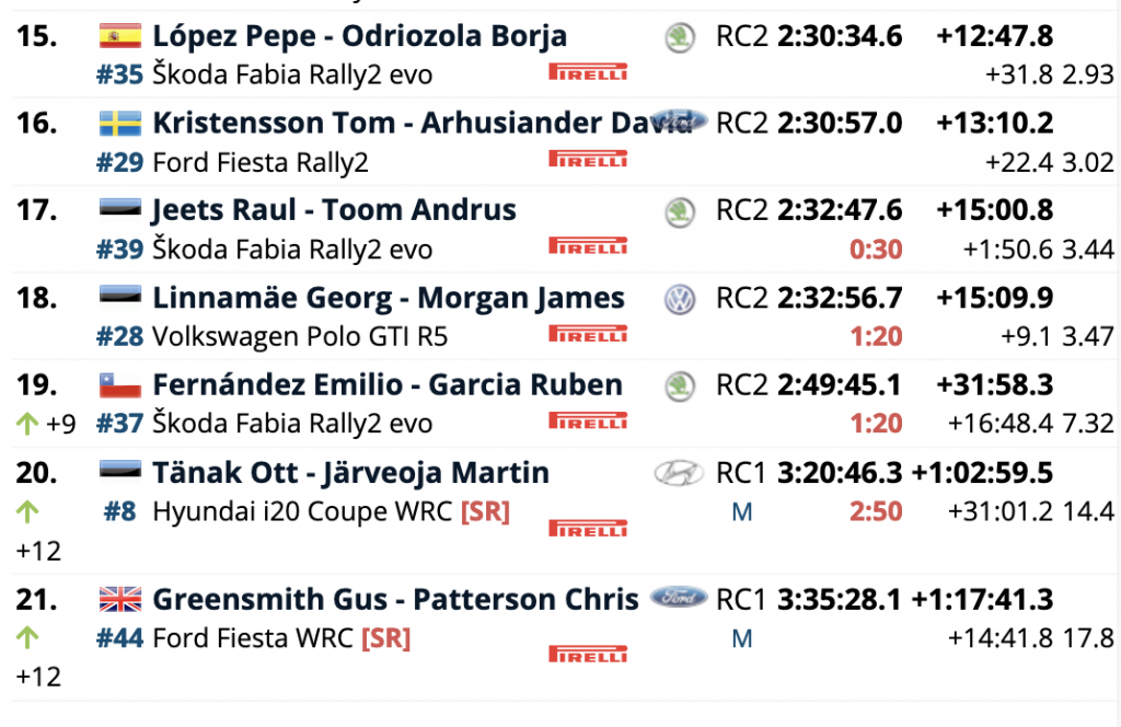 Teemu Suninen conservó la sexta posición con su Ford Fiesta, a pesar de haber hecho un trompo en el bosque en la primera prueba, y Pierre-Louis Loubet cerró la lista de los mejores en la séptima posición con un i20.