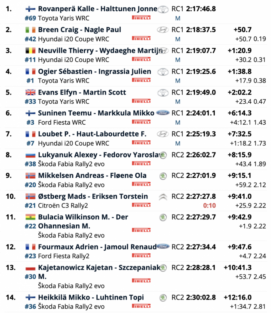 Breen, para quien el segundo puesto igualaría su resultado del año pasado en Estonia, sobrevivió a un gran susto en la corta especial final cuando golpeó una roca en el interior de una curva a la derecha. El irlandés tuvo la suerte de que su Hyundai i20 llegara cojeando a las inmediaciones con una fuga de aceite y daños en la suspensión.