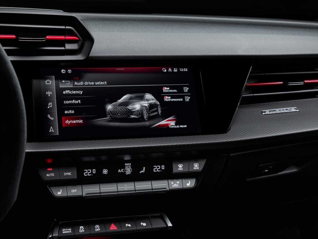 El aviso de cambio de marcha específico RS en el modo de cambio manual va modificando la visualización de las revoluciones de color verde a amarillo y a rojo, parpadeando de forma idéntica a la utilizada en competición para indicar el momento ideal para cambiar de marcha. La pantalla táctil de 26 cm (10,1 pulgadas) incluye el “RS Monitor”, que muestra las temperaturas del refrigerante, del lubricante del motor y de la transmisión, así como la presión de los neumáticos. Por primera vez en el Audi RS 3, está disponible el head-up display que proyecta información relevante sobre el parabrisas dentro del campo visual directo del conductor.