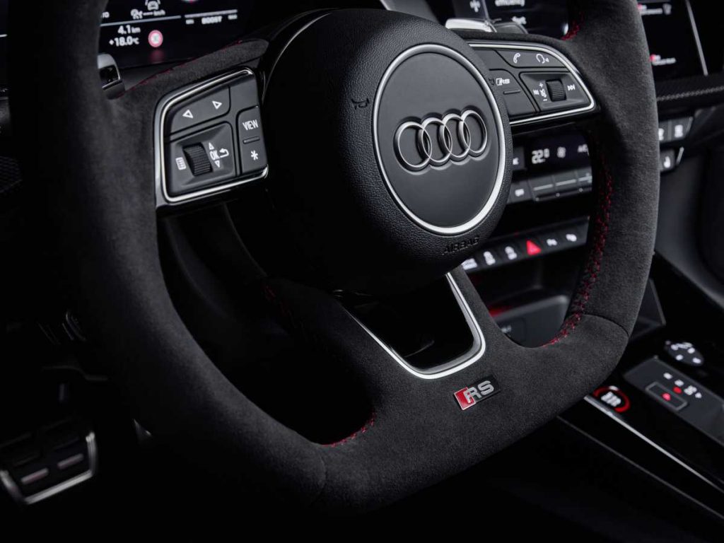 El RS 3 está equipado de serie con un volante de cuero multifuncional RS Sport de tres radios con la parte inferior achatada. Cuenta con levas de cambio integradas de zinc fundido a presión de alta calidad. El paquete design añade, además del distintivo RS, una banda en la posición de las 12 horas para indicar más rápidamente la posición del volante durante una conducción dinámica. Como alternativa, está disponible un volante RS redondo con reconocimiento de agarre capacitivo, para funciones de dirección asistida. Ambos tienen en común el nuevo botón RS Mode en el radio derecho del volante. Con este pulsador se pueden seleccionar los modos RS Performance y RS Individual del Audi drive select, o el último modo utilizado. En ambos programas RS, la visualización de los instrumentos y del head-up display tiene un aspecto aún más deportivo con un indicador de cambio intermitente.