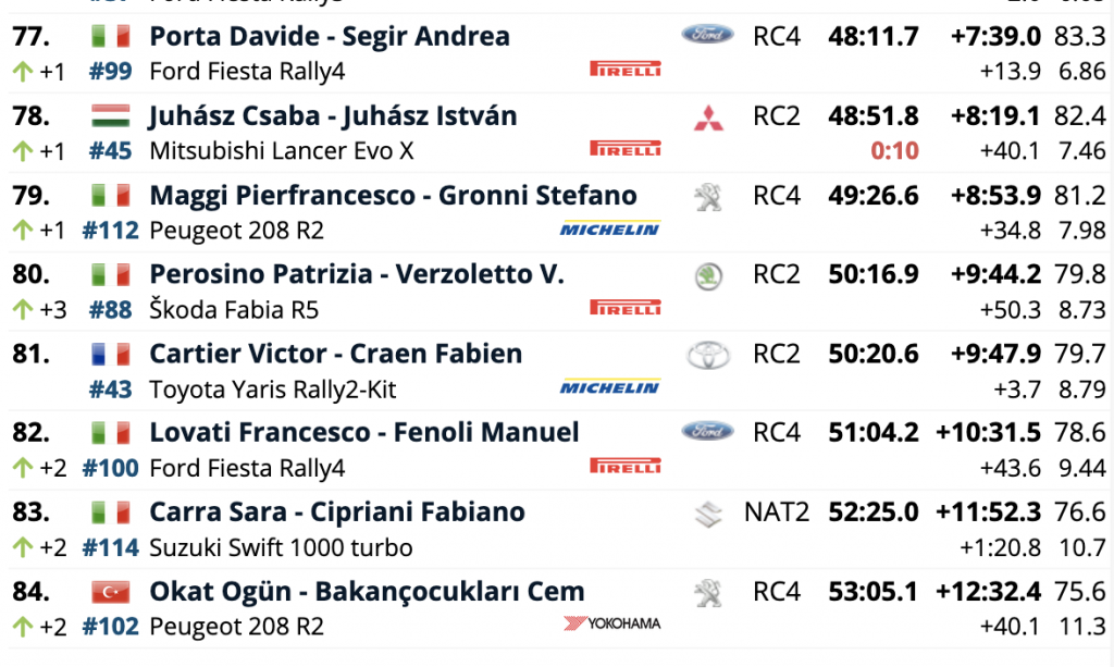 Recién salido de sus heroicas victorias en el WRC3 en el Rallye de Estonia la semana pasada, el líder del Campeonato de Europa de Rallyes de la FIA, Alexey Lukyanuk, es tercero en la general en su Citroën C3 Rally2 del Saintéloc Junior Team, 21.8 segundos detrás de Crugnola. «Deberíamos haber sido más rápidos, pero nos falta algo con la puesta a punto», dijo el ruso.