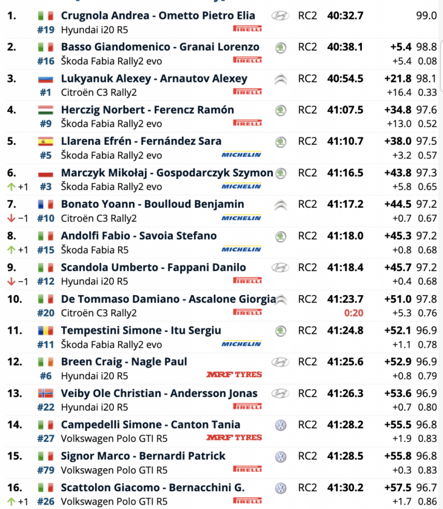 El líder del campeonato italiano, Fabio Andolfi, es octavo con 0,4 segundos por delante de Umberto Scandola, noveno, del Hyundai Rally Team Italia. Simone Tempestini está a 6.4 segundos del top 10 en undécima plaza, con Craig Breen 0.8 detrás de Tempestini en el décimo segundo lugar para el Team MRF Tires.