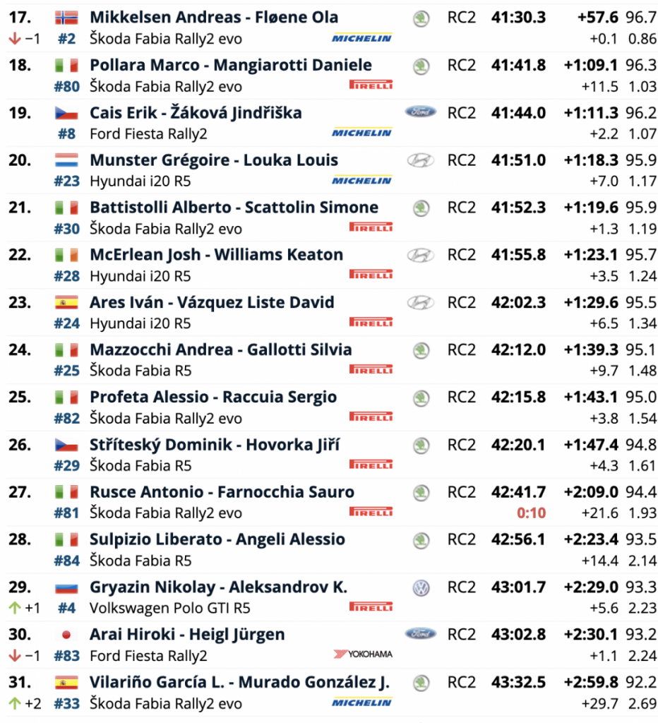 El recién llegado checo Dominik Stříteský es 23º, mientras que Gryazin está un lugar más atrás después de que se viera obligado a cambiar un neumático delantero izquierdo dañado en el TC1. Luis Vilariño es el siguiente.