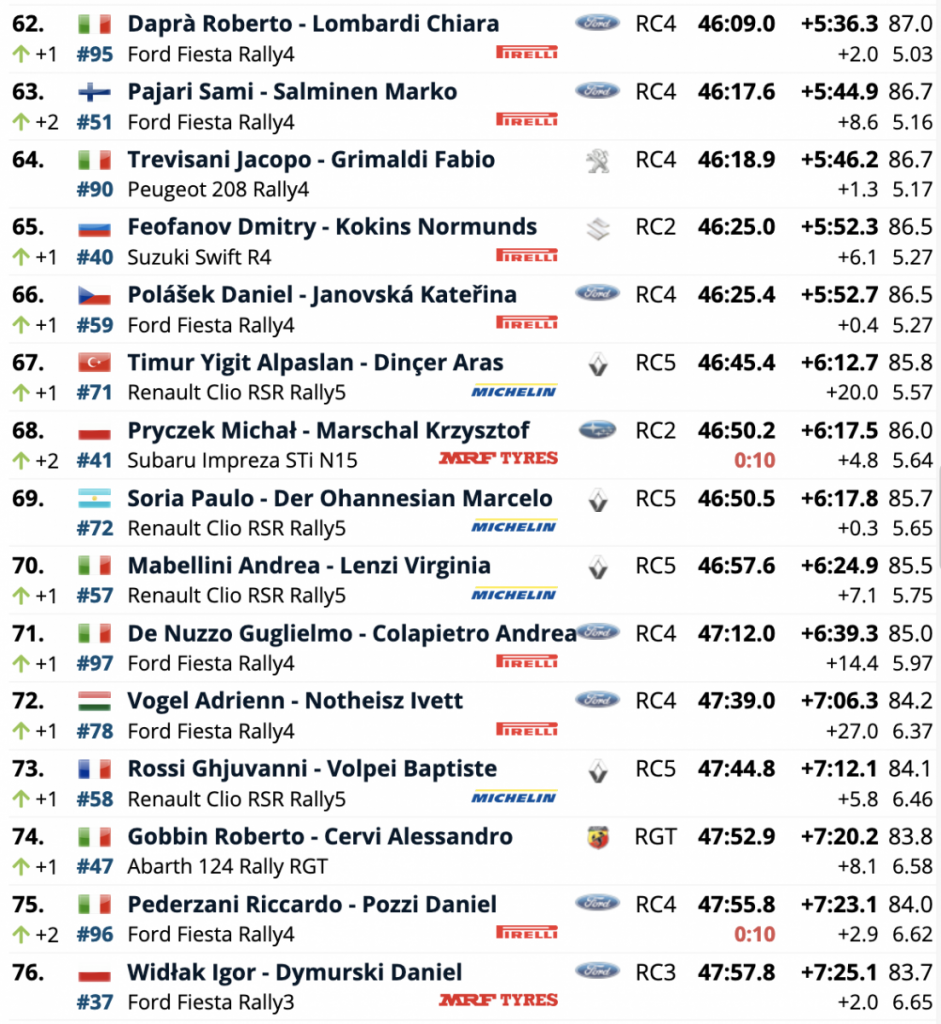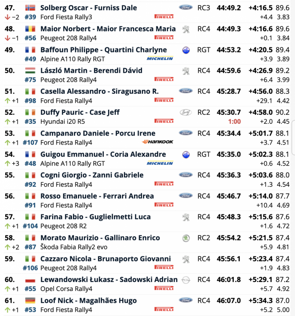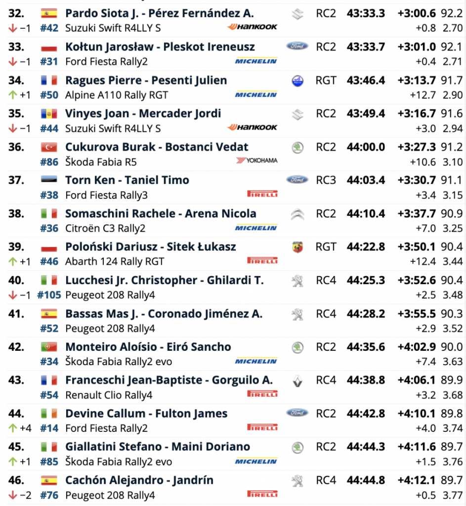 Recién salido de sus heroicas victorias en el WRC3 en el Rallye de Estonia la semana pasada, el líder del Campeonato de Europa de Rallyes de la FIA, Alexey Lukyanuk, es tercero en la general en su Citroën C3 Rally2 del Saintéloc Junior Team, 21.8 segundos detrás de Crugnola. «Deberíamos haber sido más rápidos, pero nos falta algo con la puesta a punto», dijo el ruso.